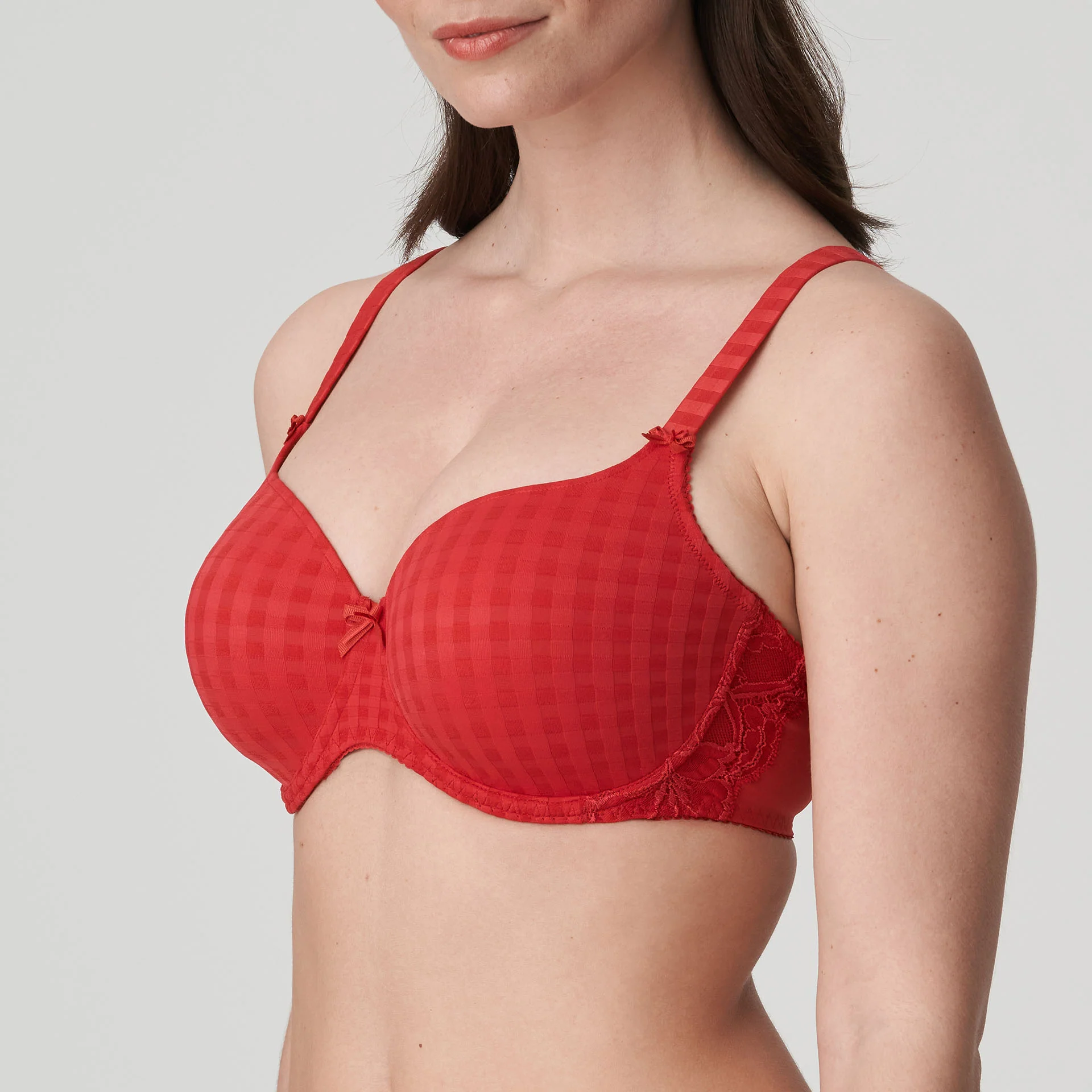 Sierlijke bh van Prima Donna uit de serie Madison van ruitjesstof met hartvormige mousse cups. Het kant aan de zijpanden geeft je een vrouwelijke look. Scarlet is het legendarische PrimaDonna-rood. Ideaal onder wit!