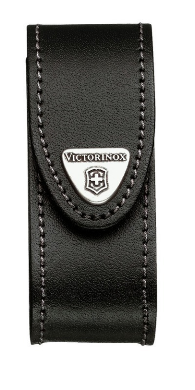 Zwart leren riemetui van Victorinox. Met metalen Victorinox embleem, klittenbandsluiting en riemlus. Voor zakmessen van 2 tot 4 lagen.