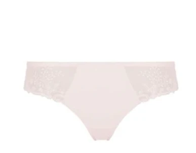 Voorkant van niet-doorschijnende gebreide stof en borduursel aan de zijkanten.