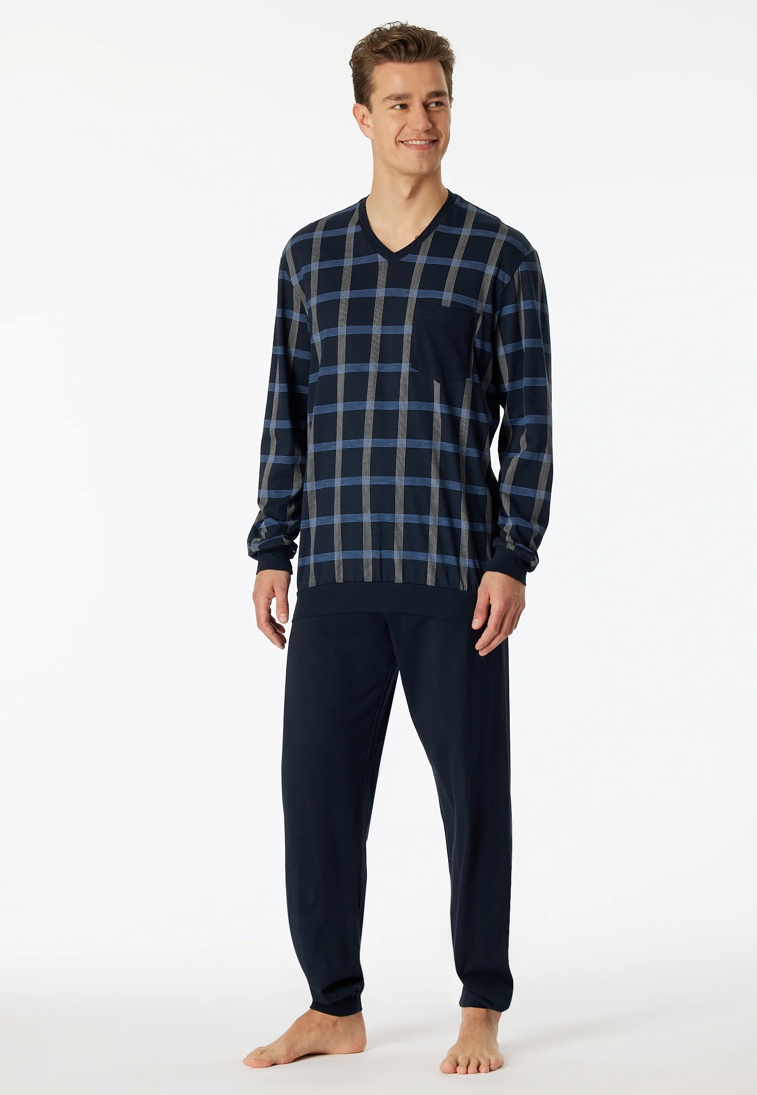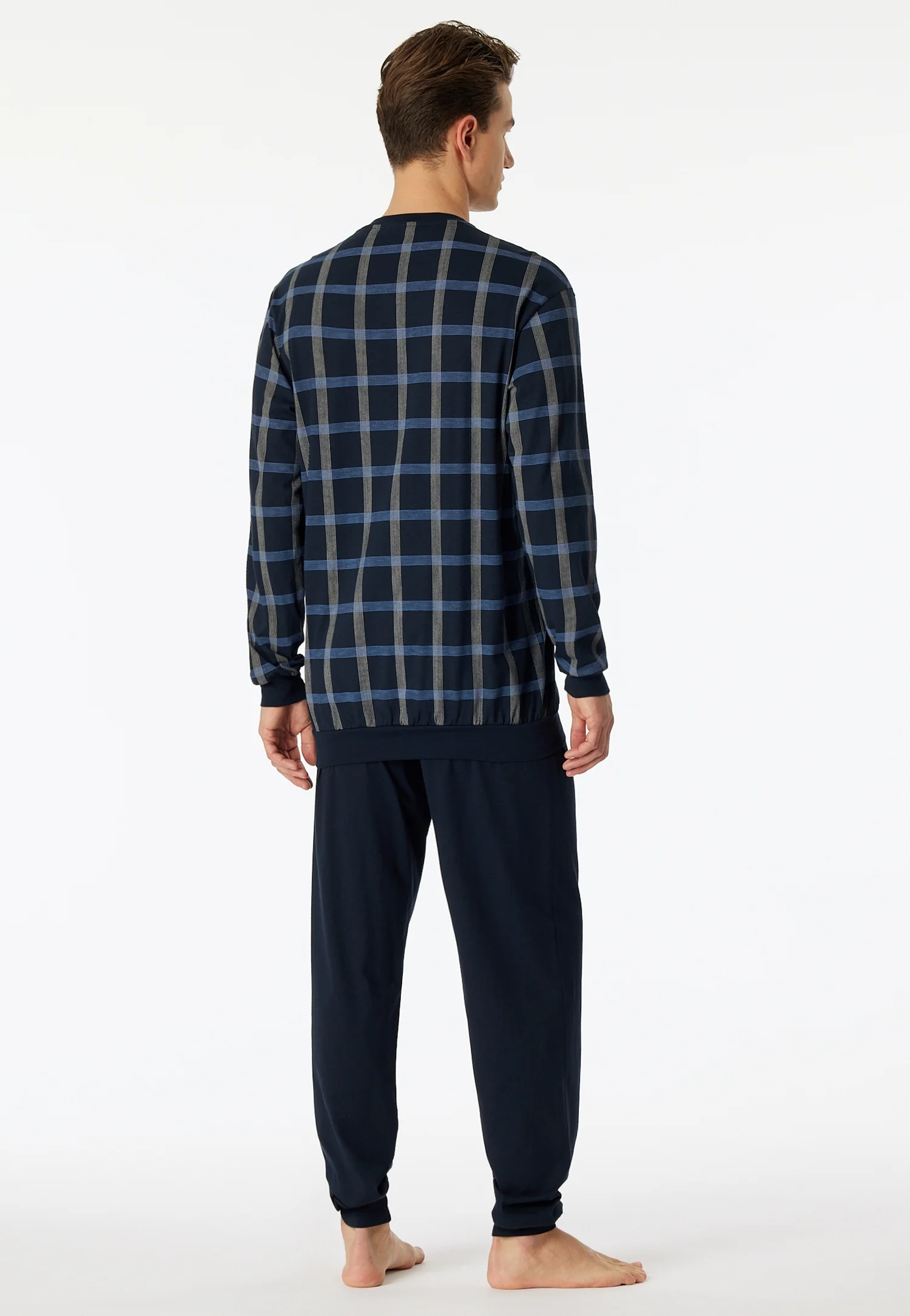 - lange herenpyjama met geruit bovenstuk in blauw-grijs, nachtblauw en wit