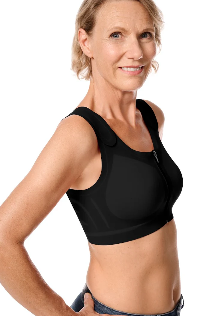 Extra gebruiksgemak biedt de naadloze hoes voor borstprotheses of shapers en de praktische voorsluiting met rits en magneetsluiting, ideaal voor mensen met verminderde vingervaardigheid.