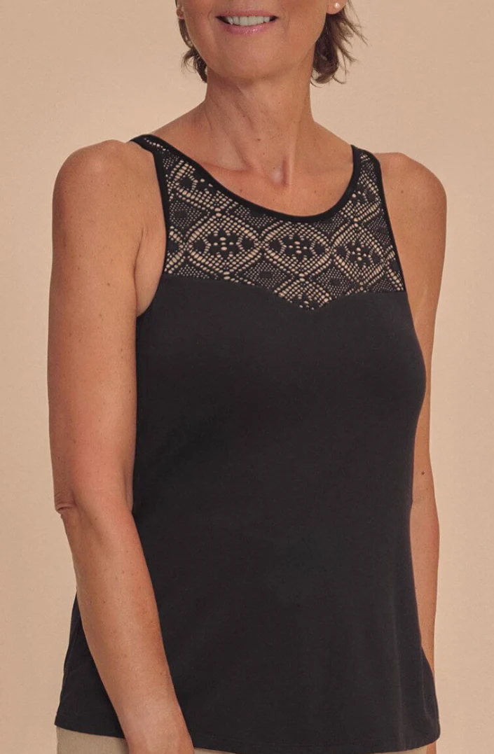 Stijlvolle top met hoge hals en een elegant gehaakt kanten inzetstuk bij de halslijn. Gemaakt van zachte, ademende viscosevezels die zorgen voor een prettig huidklimaat. De ondersteunende binnenbustier met zacht gevoerde cups en geïntegreerde bilaterale hoesjes biedt comfort en zekerheid bij het dragen van een borstprothese of shaper. Dankzij de innovatieve Amoena Wave Seam-technologie in de onderbusteband geniet je van extra ondersteuning aan de zijkanten. Voorzien van verstelbare bandjes en geschikt voor cupmaat B en C.