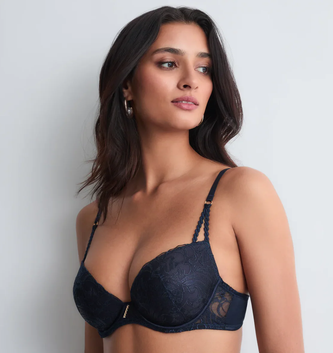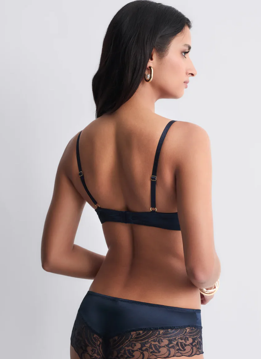 De Satin Memories voorgevormde plunge BH is modern, sensueel en luxueus. Met verfijnd Frans borduursel, glanzend Italiaans satijn en een gouden bamboe-bedel straalt deze BH pure elegantie uit. De diepe halslijn en voorgevormde cups creëren een prachtig decolleté, terwijl de guipure bandjes en zachte satijnen achterkant zorgen voor optimaal comfort en een moderne uitstraling.