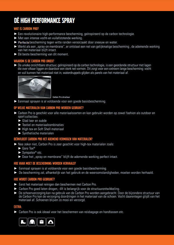 1x sprayen met de Collonil Carbon Pro is al genoeg voor een optimale basisbescherming. Doe dit buiten of in een goed geventileerde ruimte.