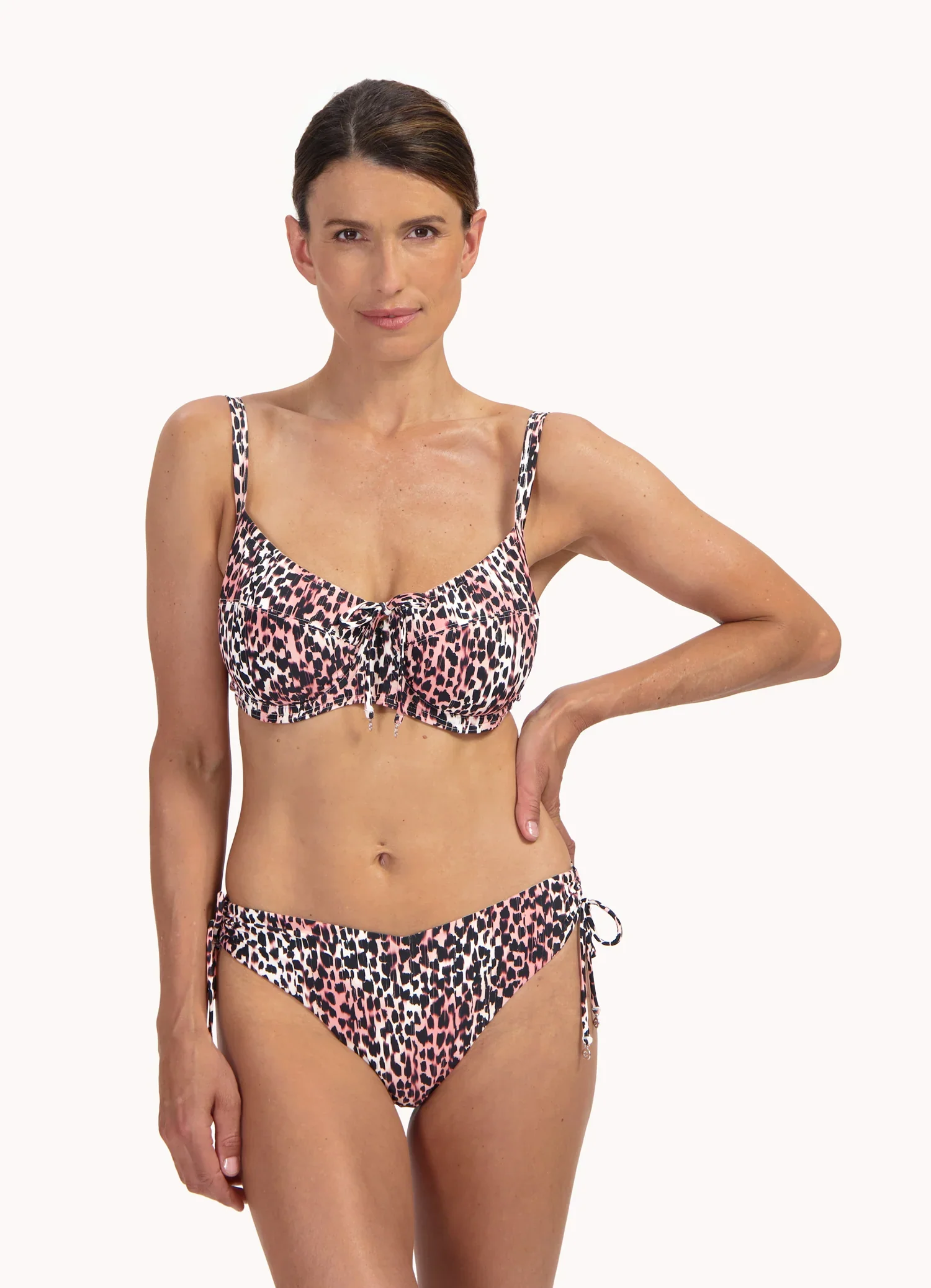 De verstelbare schouderbandjes maken het eenvoudig om de pasvorm perfect af te stellen. Daarnaast geven de verstelbare aansnoerkoordjes bij de cups de top een speels detail én de mogelijkheid om de bedekking naar wens aan te passen. De meerkleurige print met bruine tinten zorgt voor een warme, zomerse uitstraling. Combineer deze top met het bijpassende broekje of mix & match met een uni bikinislip.