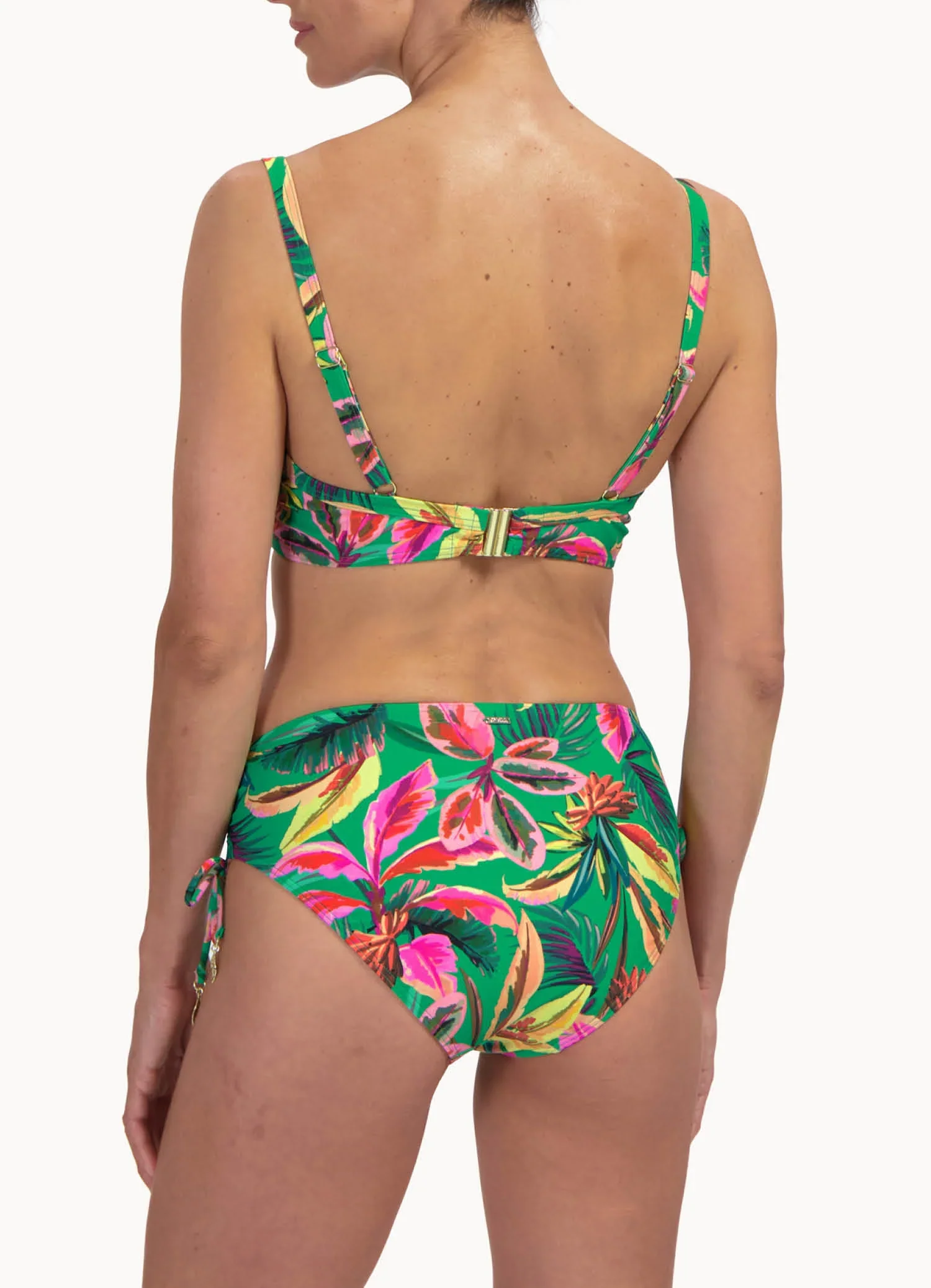 Dankzij de verstelbare strikkoordjes aan de zijkanten kun je de beenuitsnede eenvoudig aanpassen. Trek je de koordjes iets aan, dan maak je de zijkanten korter en creëer je optisch meer beenlengte. Zo stem je de pasvorm af op jouw voorkeur en lichaamsvorm. De groene basis met gekleurde print maakt dit broekje perfect om te combineren met de bijpassende bikinitop of tankini top.
