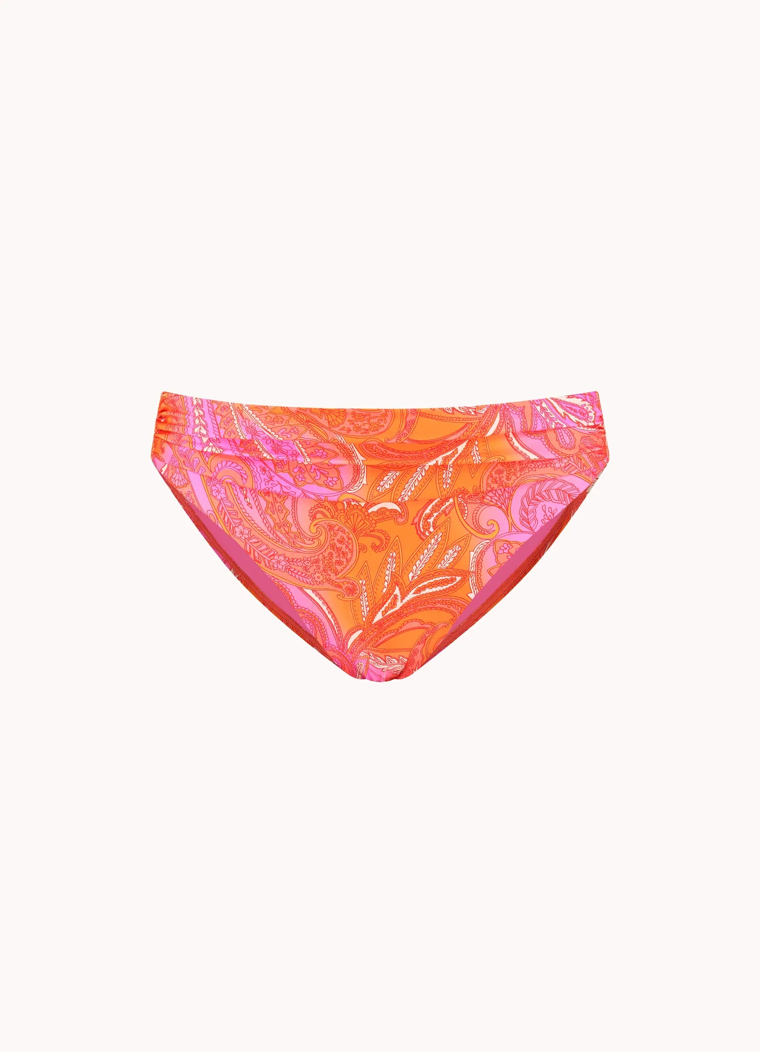 Bikinibroekje met plooitjes in de tailleband – roze/oranje multicolor print