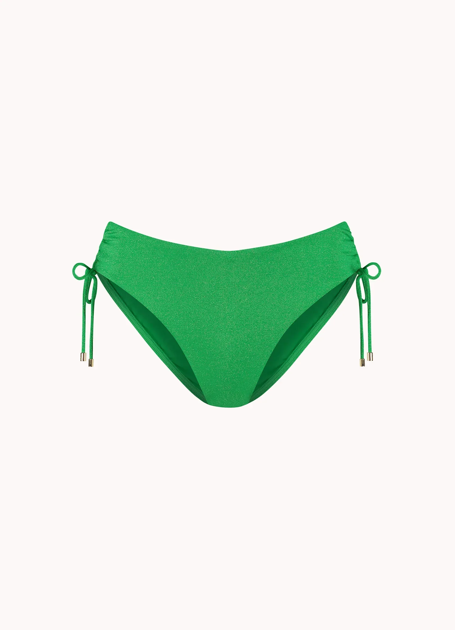Hoog uitgesneden bikinibroekje met V-shape en strikkoordjes – groen glitter