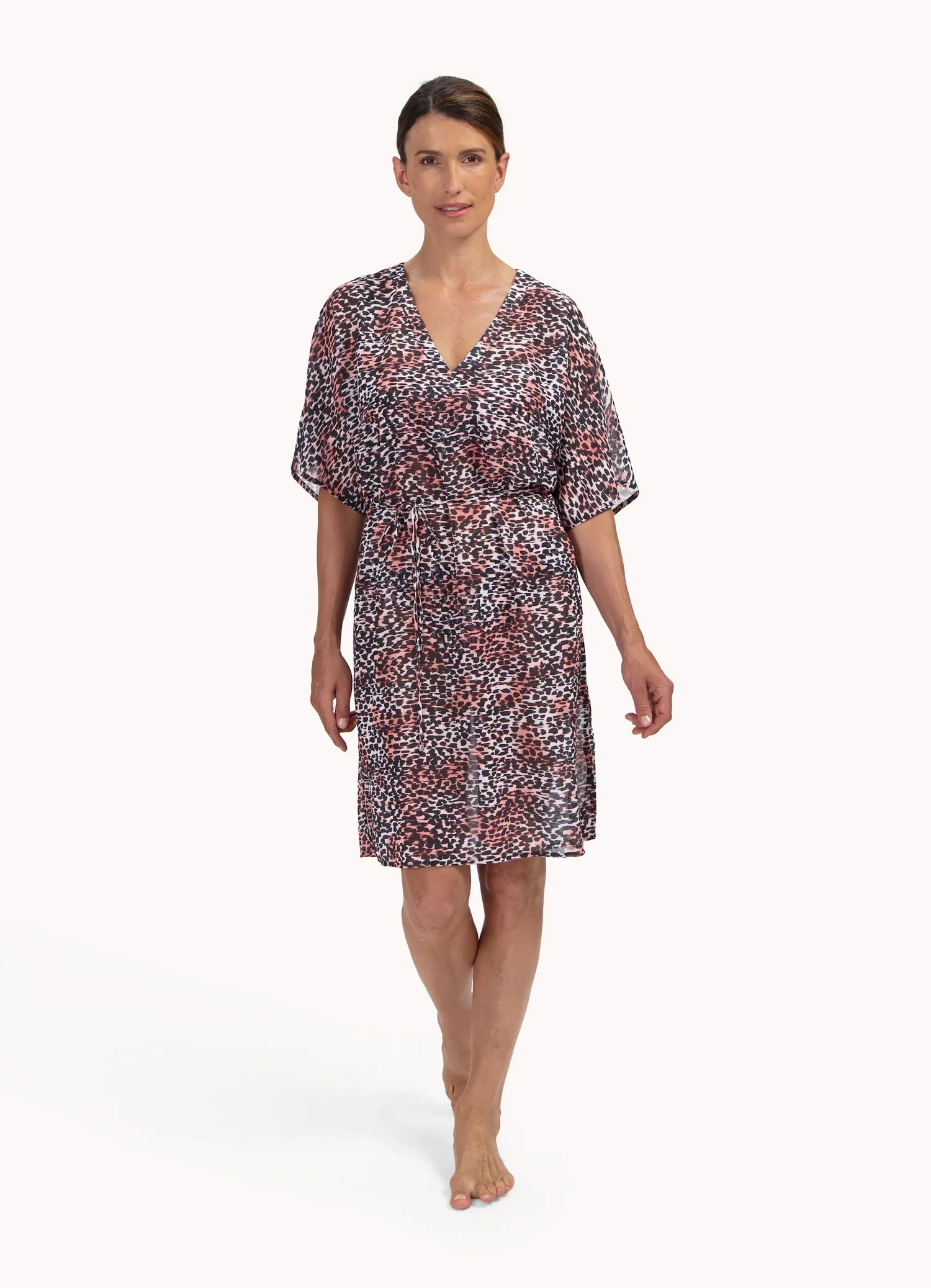 Deze luchtige tuniek is ideaal voor warme zomerdagen en als stijlvolle cover-up over je badkleding. De diepe V-hals en de soepelvallende vlindermouwen geven de tuniek een vrouwelijke, elegante uitstraling. Met het koordje in de taille creëer je eenvoudig een mooi silhouet, zodat je de tuniek zowel los als getailleerd kunt dragen.