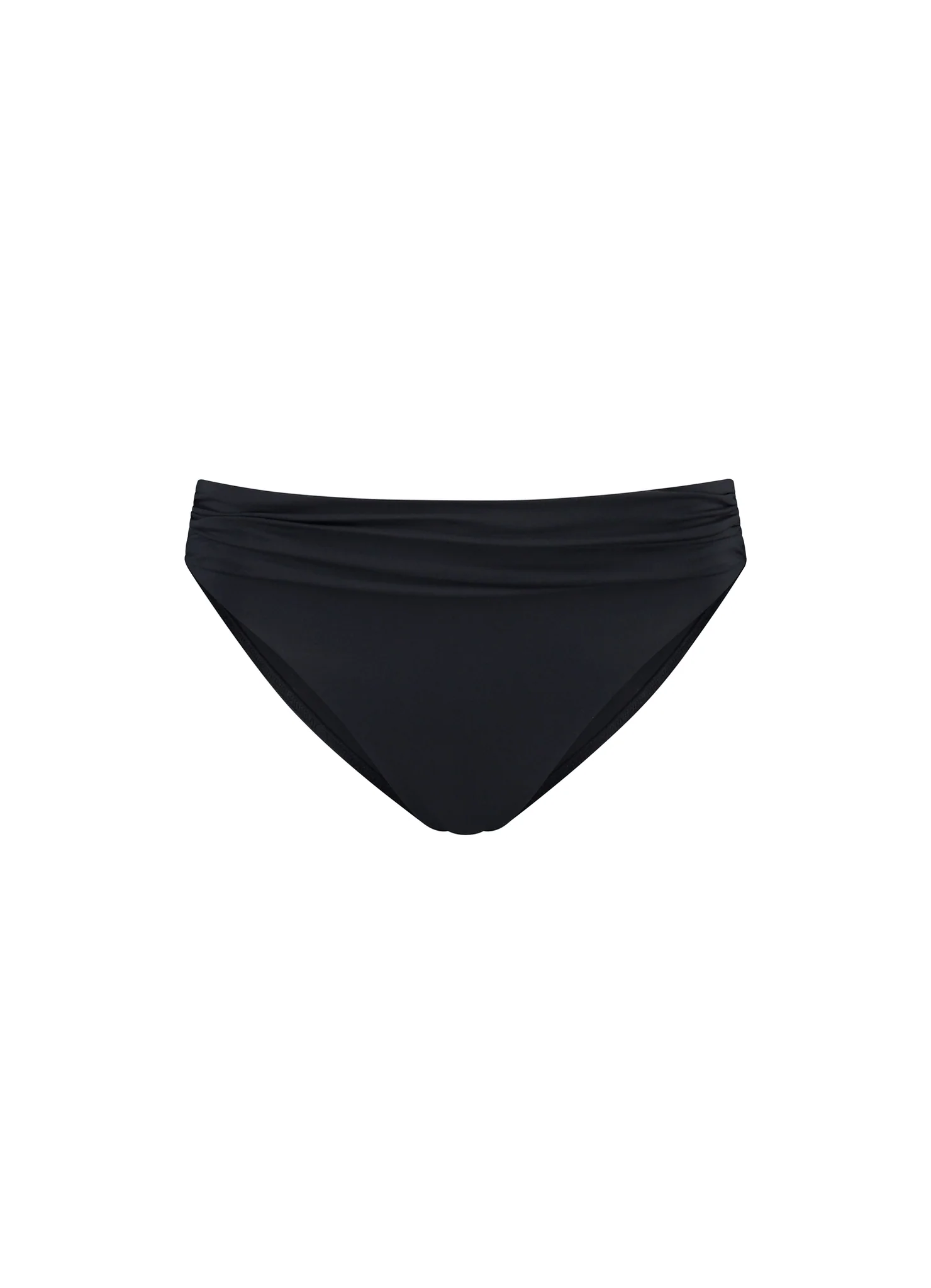 Het Cyell Femme Noir Regular bikinibroekje in zwart heeft een medium taille die net boven de heupen valt en biedt medium bedekking voor een comfortabele pasvorm. De geplooide tailleband camoufleert subtiel een klein buikje en geeft een flatterend silhouet, terwijl de uni-stof een tijdloze, elegante look creëert. Gemaakt van 85% gerecycled polyamide en 15% elastaan voor duurzaamheid en draagcomfort.