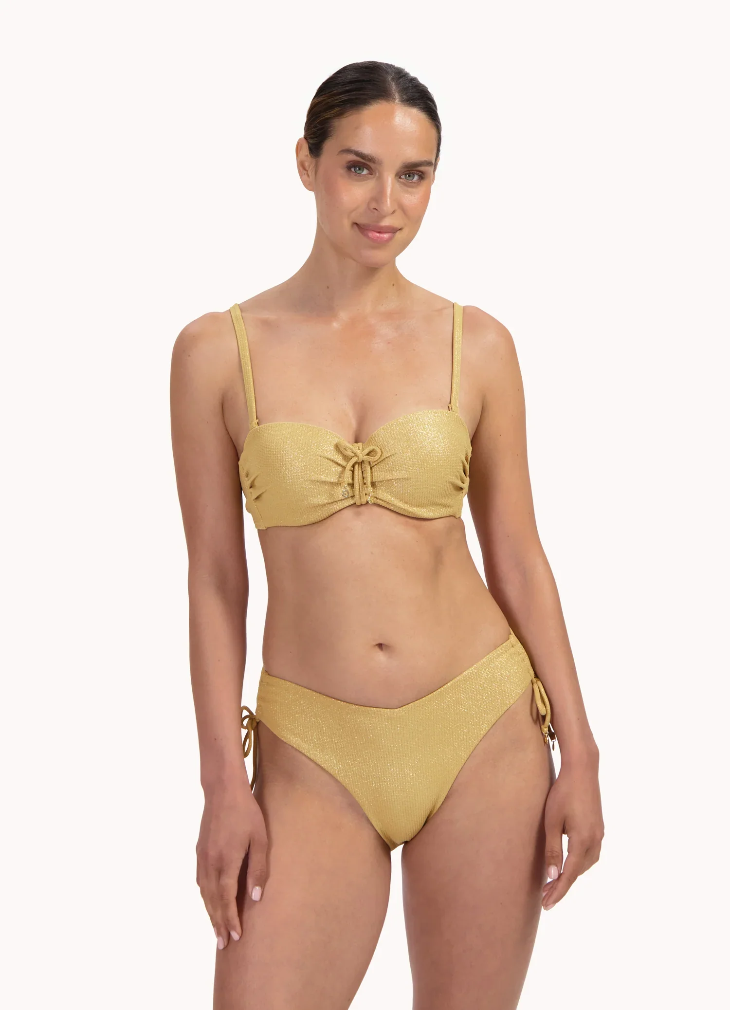Dit high-leg bikinibroekje uit de Cyell Golden Hour collectie combineert elegantie met een flatterende pasvorm. De hoge taille met V-vorm accentueert je vrouwelijke silhouet, terwijl de hoge beenuitsnijding je benen optisch langer laat lijken. Verstelbare strikkoordjes aan de zijkanten zorgen dat je de pasvorm naar wens kunt aanpassen. Medium bedekkend en uitgevoerd in sprankelend goud glitter. Stofsamenstelling: 93% polyamide, 7% elastaan. Model is 1,78 m en draagt maat 38.