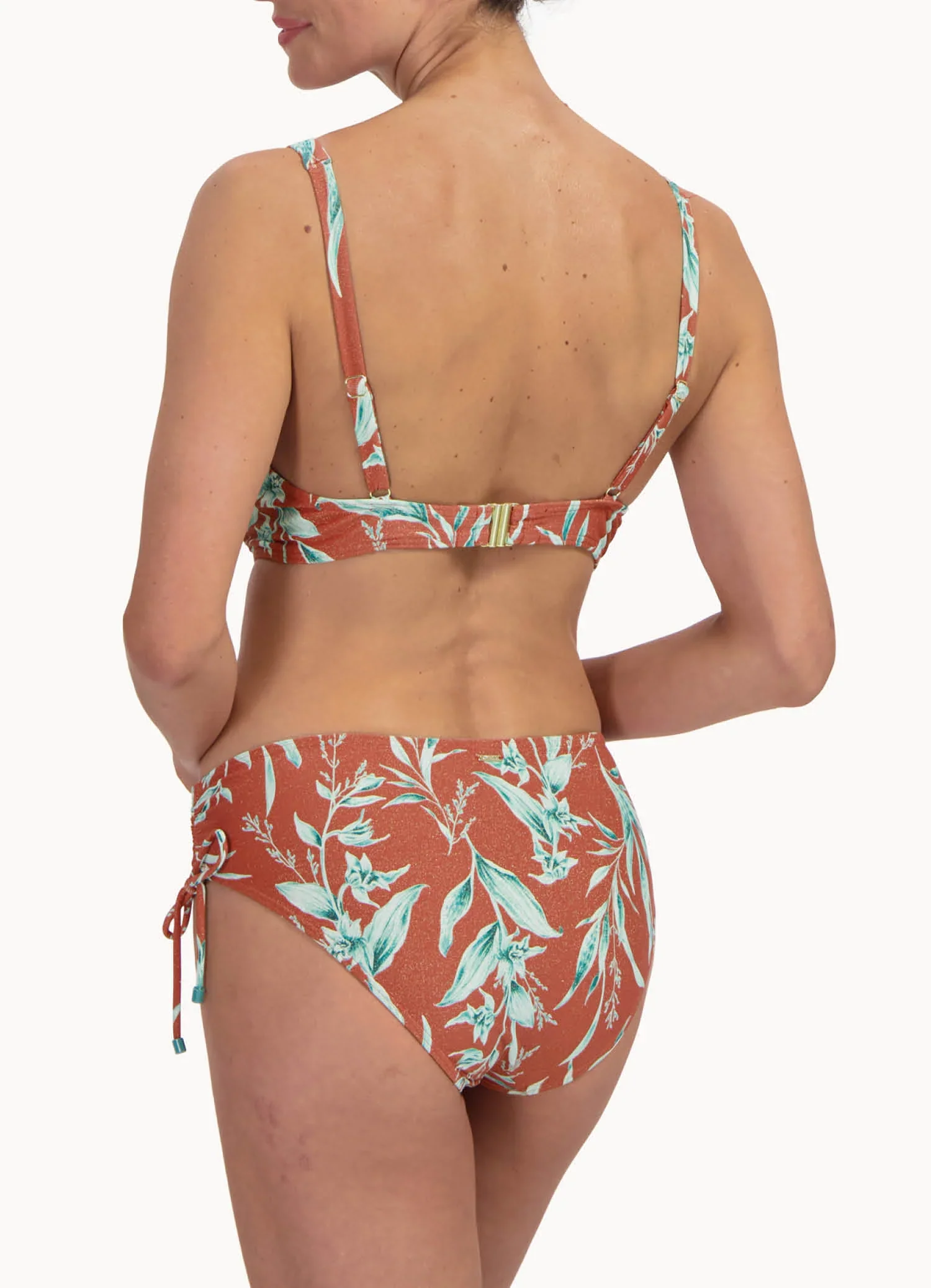 Voor een persoonlijkere look kun je de strikkoordjes aan de zijkanten gebruiken om de beenuitsnede iets hoger of lager te maken, waardoor het broekje perfect aan jouw wensen kan worden aangepast. Het opvallende glitter roodbruine materiaal met turquoise print geeft een glamoureuze en zomerse uitstraling.