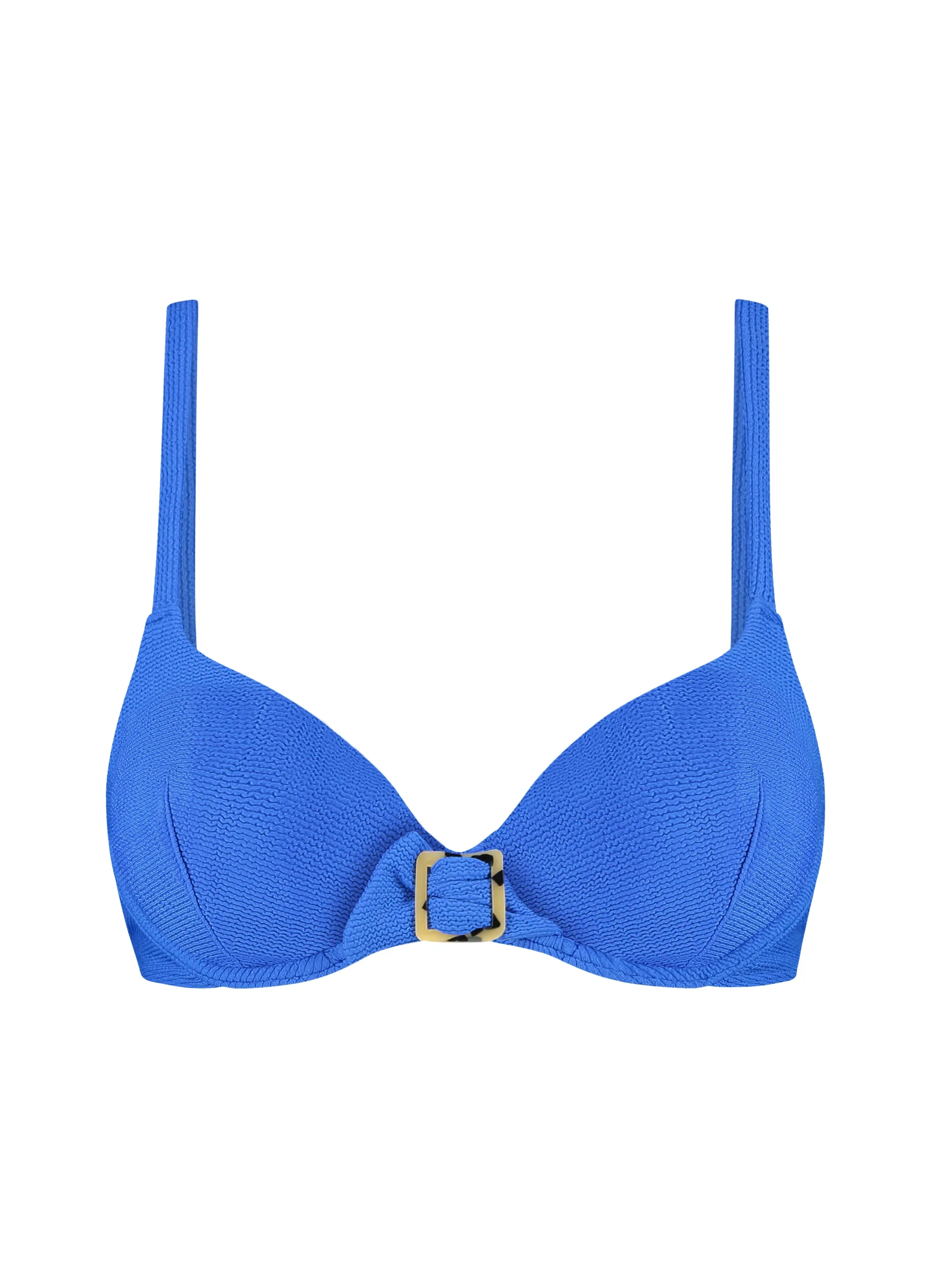 De Wavy Blue Feminine Bikinitop biedt zowel stijl als ondersteuning. Deze bikinitop is gemaakt van 93% polyamide en 7% elastaan en heeft beugels en voorgevormde cups voor een perfecte pasvorm. De smalle bandjes kunnen over de schouders en gekruist op de rug worden gedragen voor extra draagcomfort. Het blauwe structuurstof en het buckle detail zorgen voor een elegante, moderne uitstraling. Ideaal voor een zelfverzekerde en comfortabele strandlook.