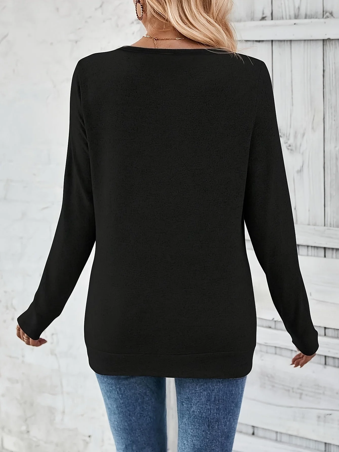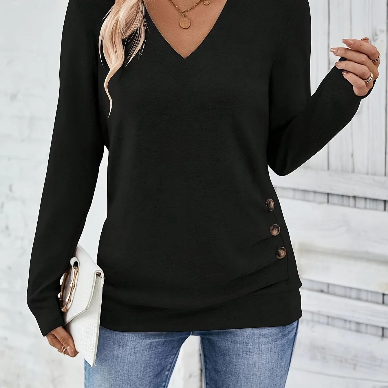 Het Elise elegante V-hals T-shirt met lange mouwen en knoopdetail is een verfijnde toevoeging aan je garderobe. Dit T-shirt combineert stijl en comfort, perfect voor de lente en herfst.