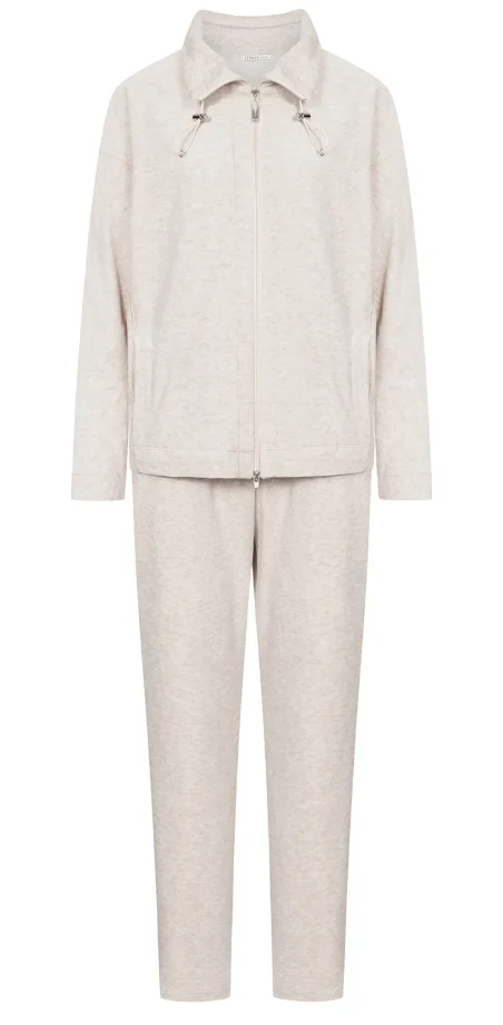 Dit stijlvolle huispak heeft een moderne oversize look en is gemaakt van een modieuze velours gemêleerde stof, perfect voor ontspanning en comfort thuis. Het huispak bestaat uit een jasje en een lange broek, beide ontworpen voor een relaxte en trendy uitstraling. Het jasje heeft een opstaande kraag met een variabel trekkoord, een praktische 2-weg ritssluiting en zijzakken. De broek heeft een elastische tailleband voor extra draagcomfort en is voorzien van zijzakken.
