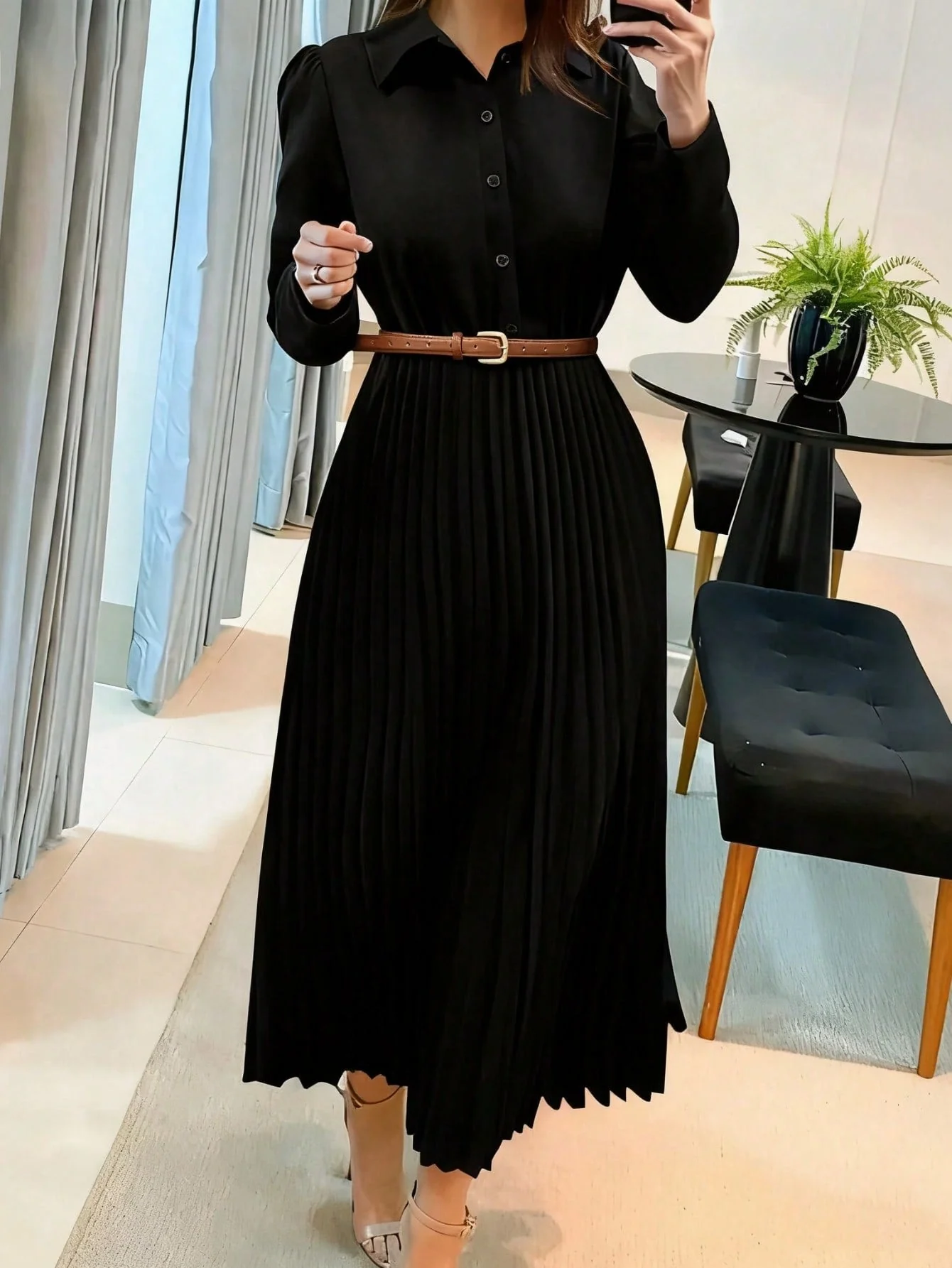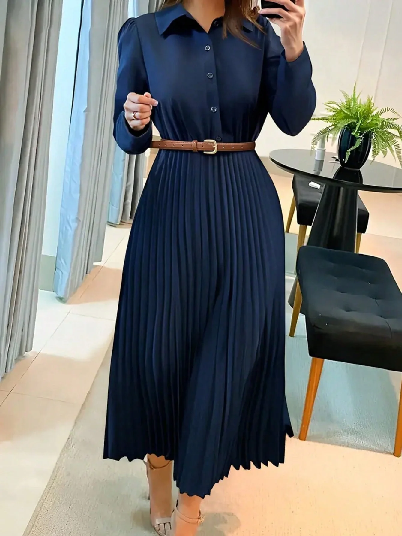 Deze geplooide jurk met lange mouwen en knoopsluiting aan de voorkant combineert een klassieke kraag met een regular fit voor een elegante, vloeiende uitstraling. De effen stof voelt glad aan en de plooien vanaf de taille geven de jurk een subtiel a-lijn silhouet. Zonder zakken en met een ronde hals is deze jurk geschikt voor verschillende gelegenheden, van werk tot smart casual momenten in het najaar.