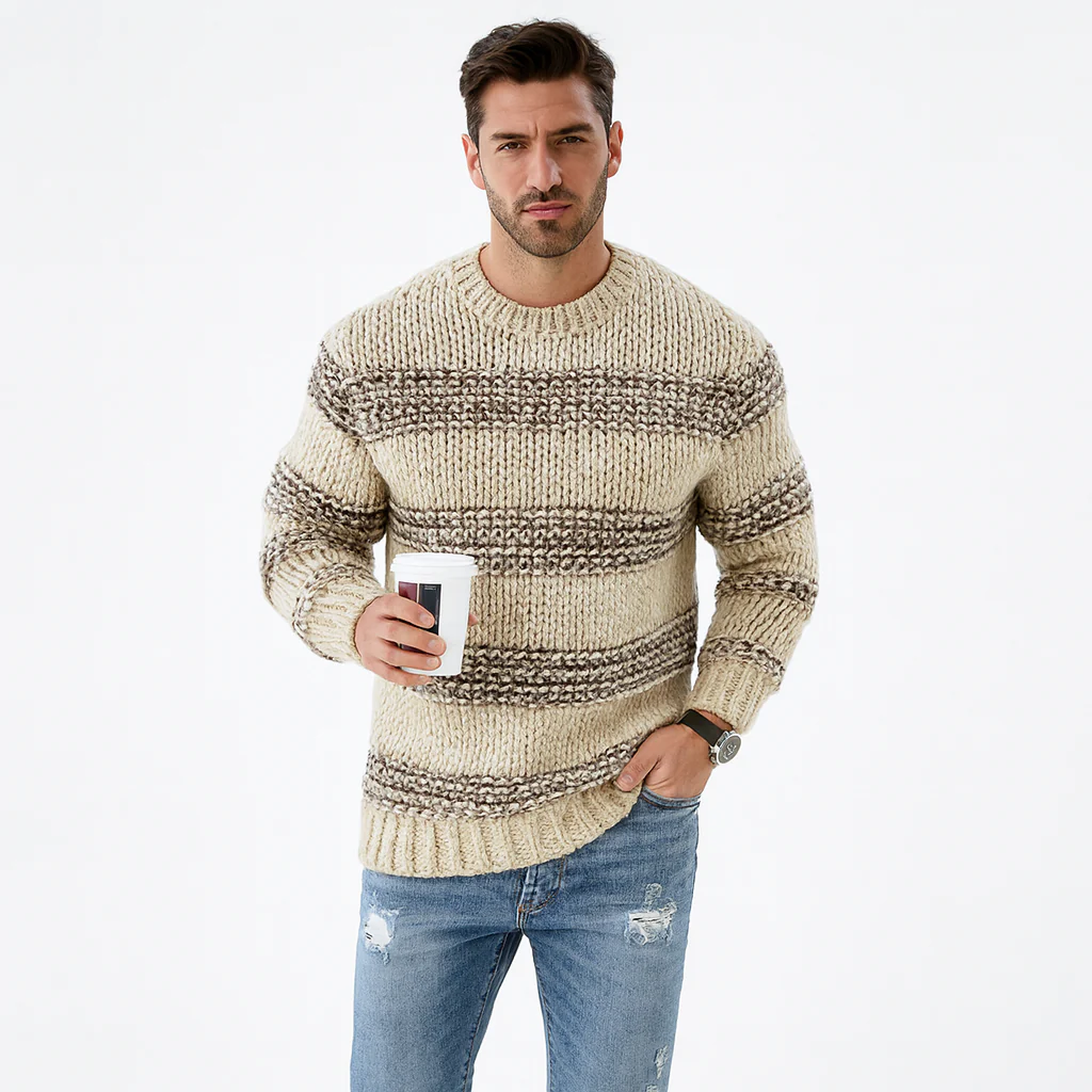 Deze grof gebreide trui heeft een ronde hals, lange mouwen en een regular fit die comfortabel aanvoelt. De beige basis wordt geaccentueerd door donkerbruine en grijze strepen, terwijl de ribgebreide mouwuiteinden en de iets langere achterkant zorgen voor een moderne uitstraling. Ideaal als casual trui voor frisse herfstdagen.