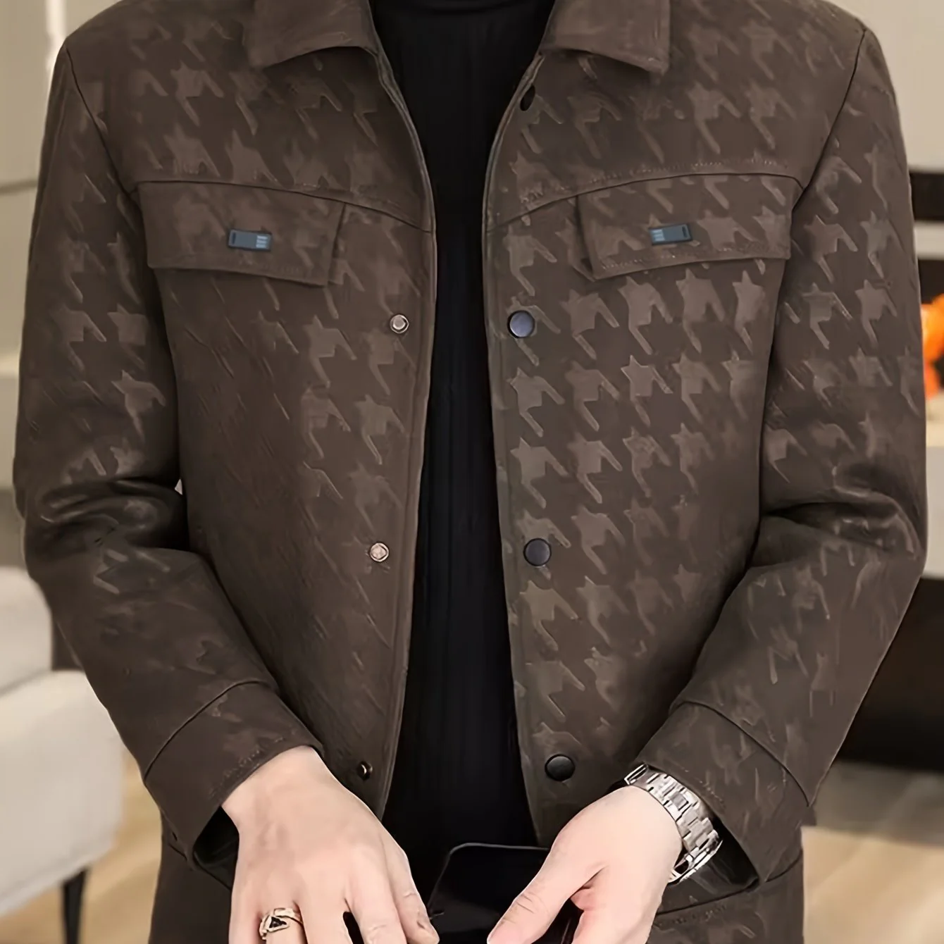 Ontdek de tijdloze elegantie van onze heren jas met pied-de-poule patroon en fleece voering. Deze jas combineert klassieke stijl met modern comfort, ideaal voor de modebewuste man.