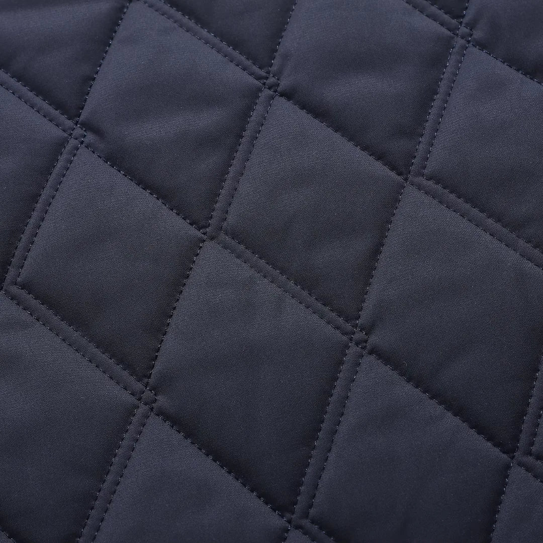 Deze gequilt jas combineert een klassieke kraag met een nette knoopsluiting en lange mouwen voor een verzorgde uitstraling. Gemaakt van stevig polyester met een subtiele leren afwerking langs de zijzakken, biedt de jas een comfortabele regular fit en een donkerblauwe binnenvoering met diamantpatroon. Ideaal voor herfst en winter, geschikt voor zakelijke gelegenheden en smart casual momenten.