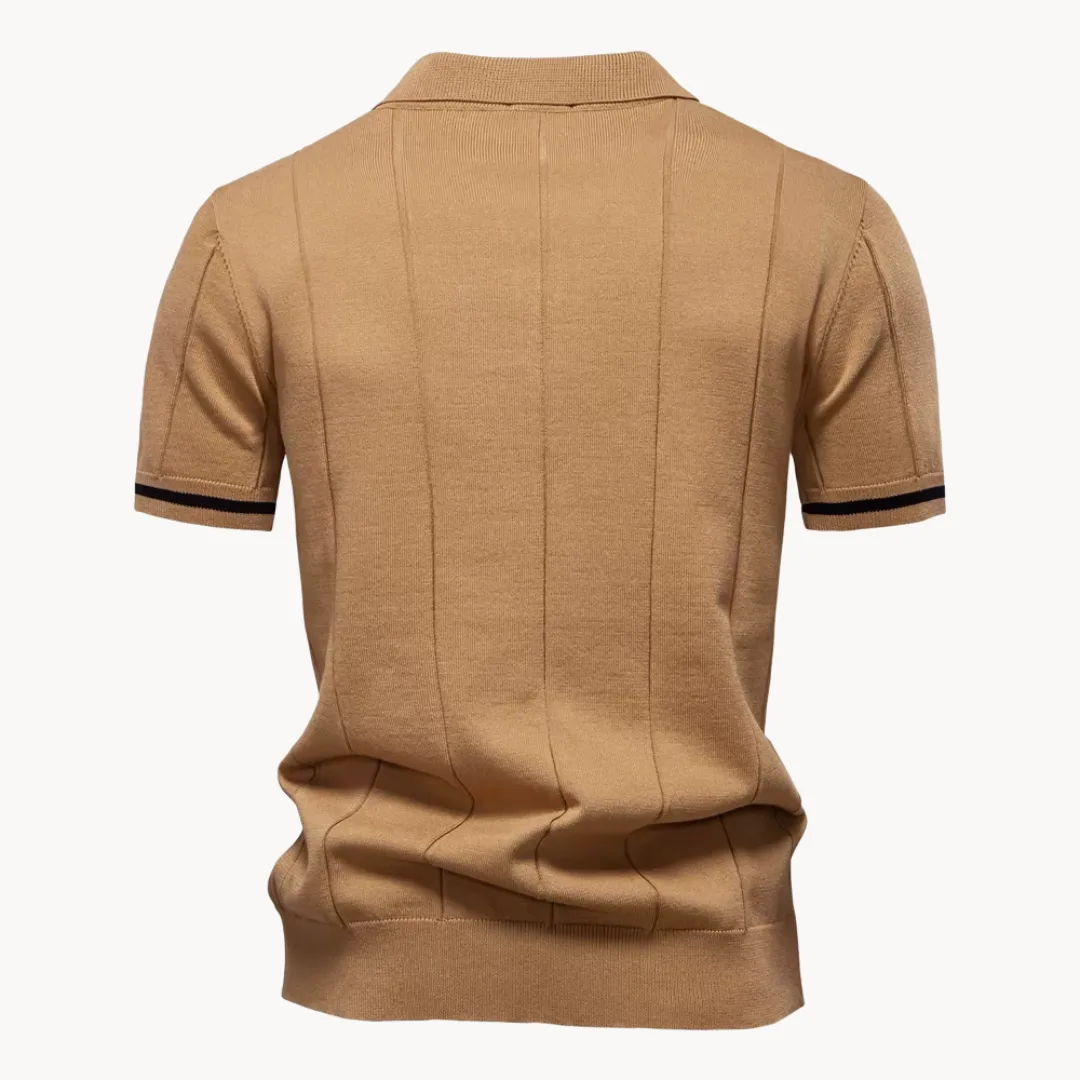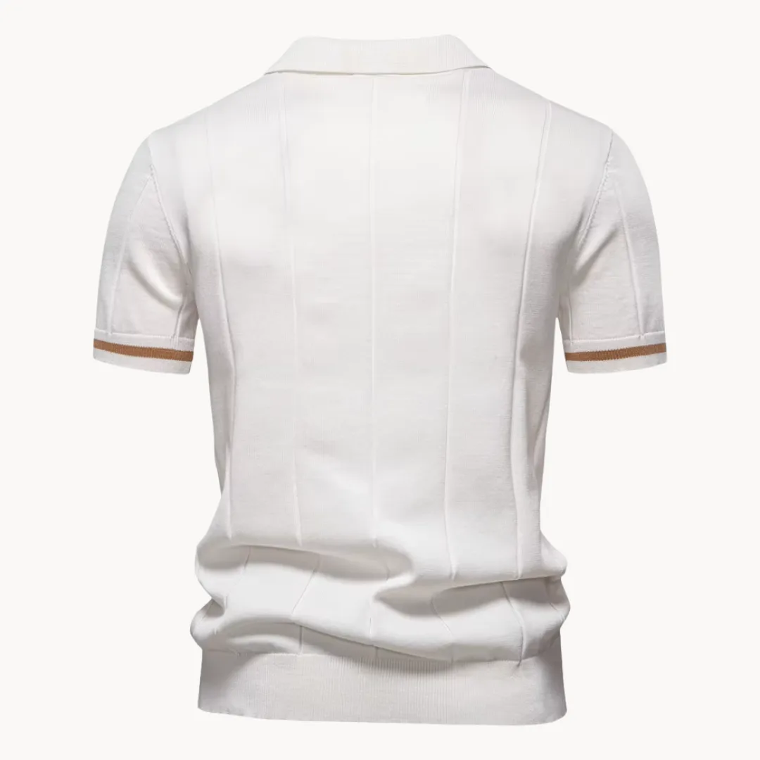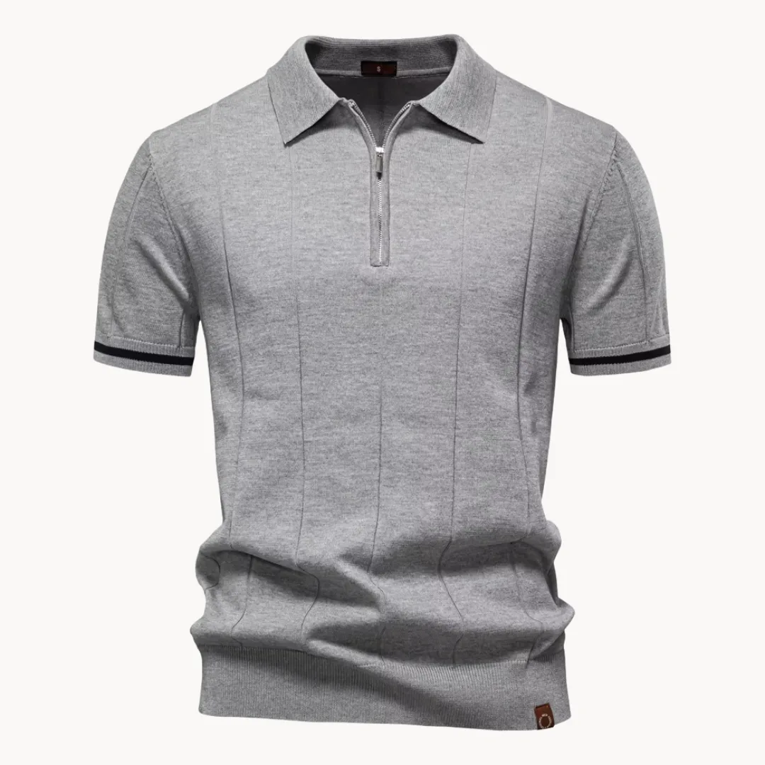 Polo met korte rits en klassieke kraag, uitgevoerd in een lichte, gladde knit met subtiele verticale naden die de regular fit mooi accentueren. De korte mouwen zijn afgewerkt met een gestreepte rand voor een verfijnd detail. Deze polo voelt zacht aan en biedt comfort voor zowel casual als smart casual momenten.