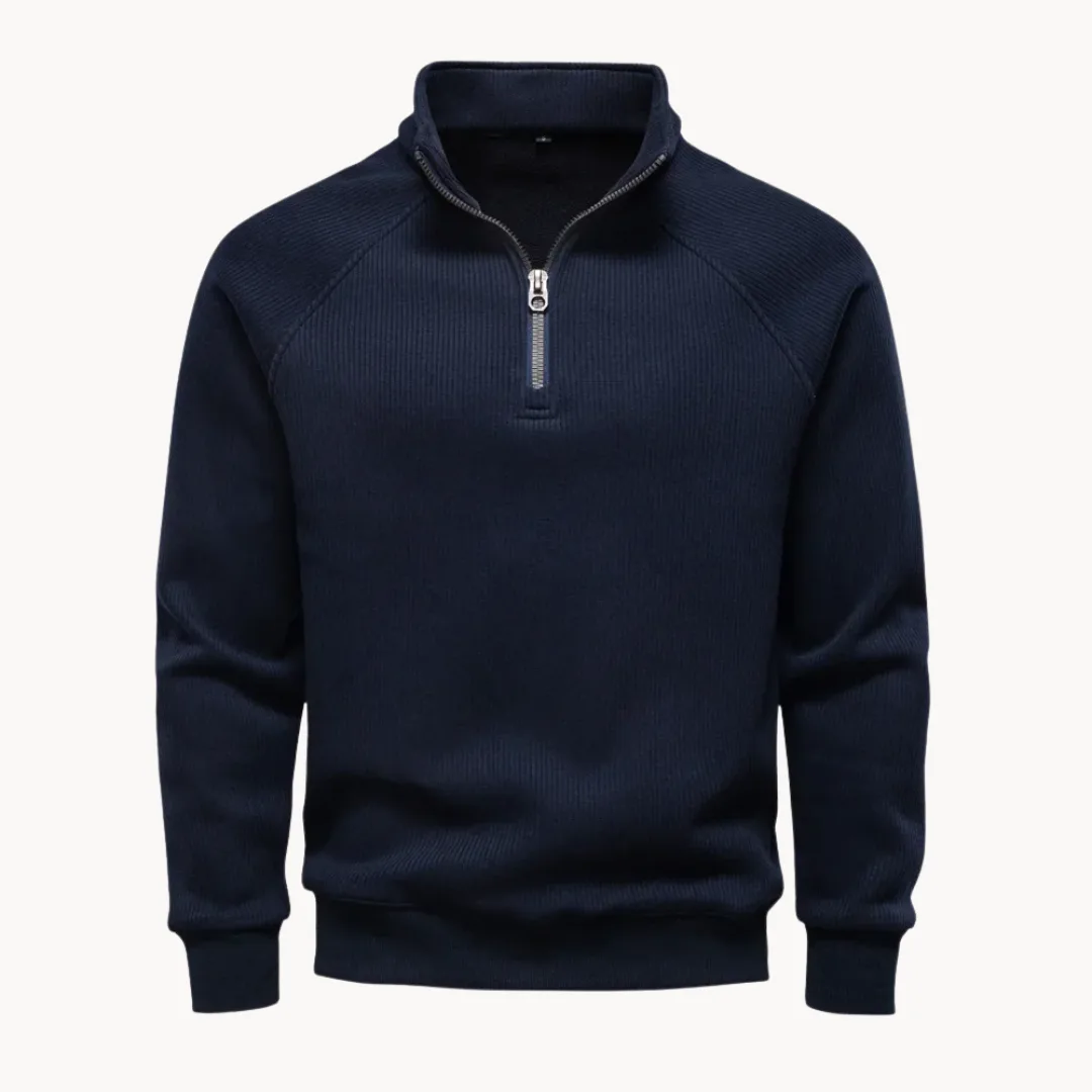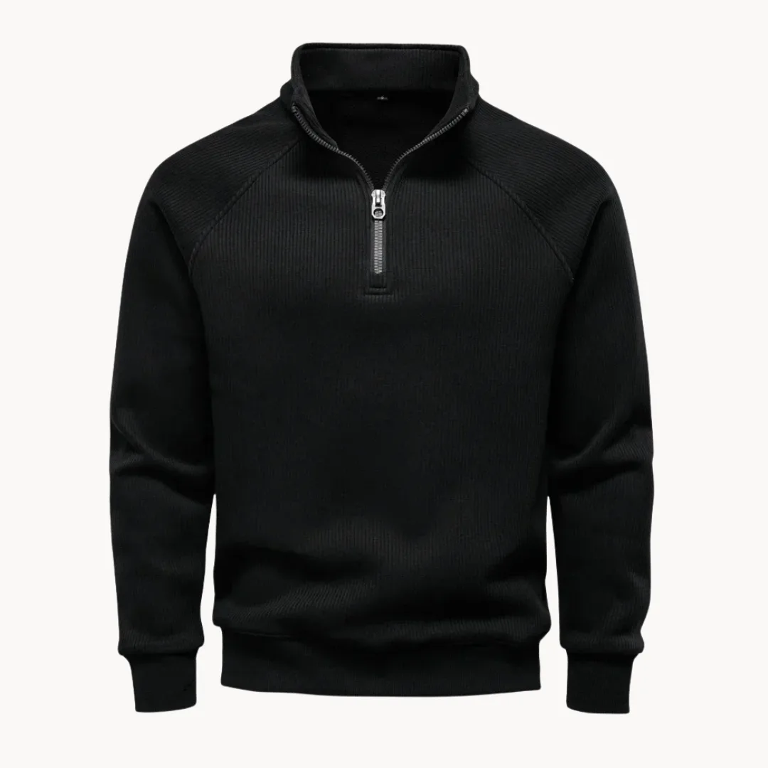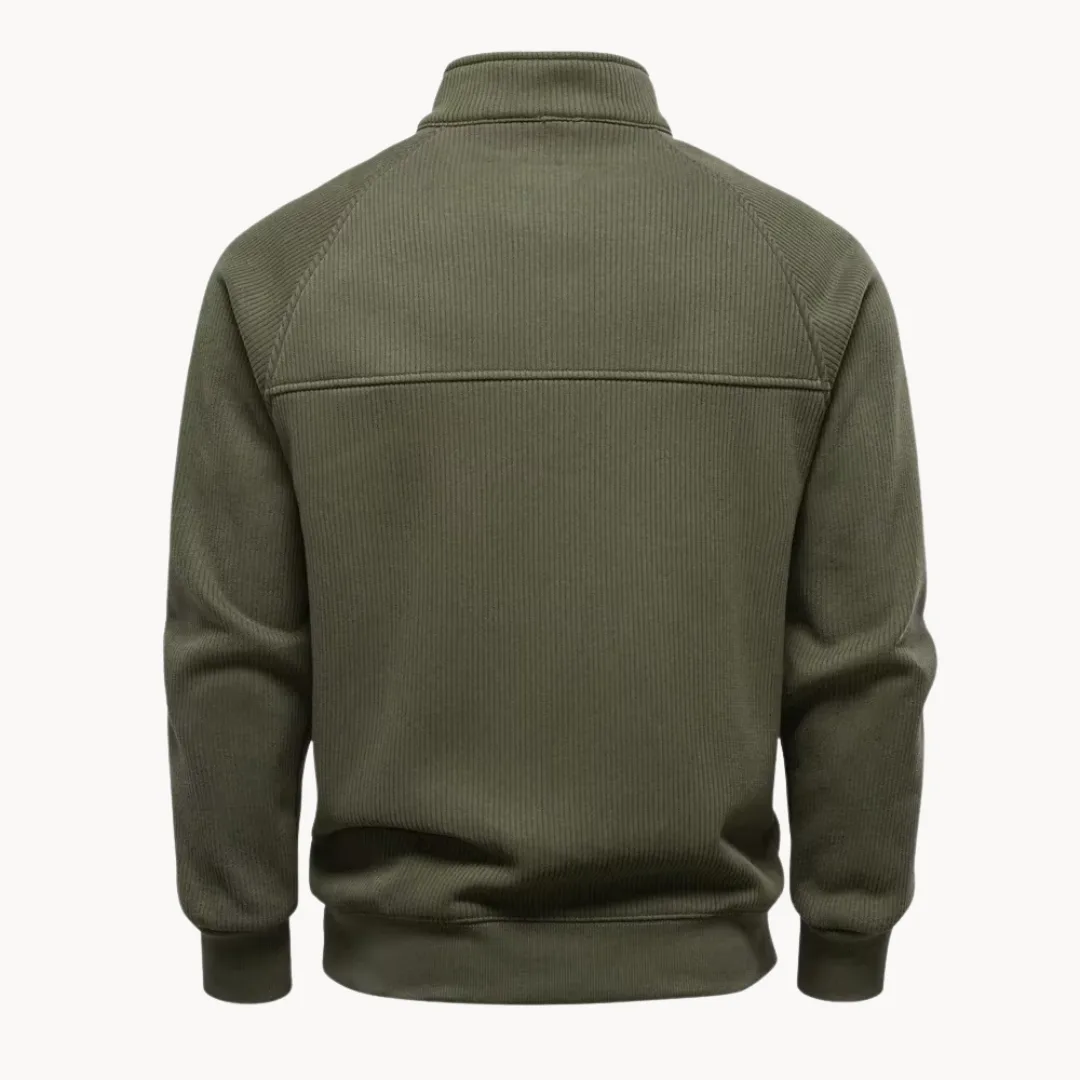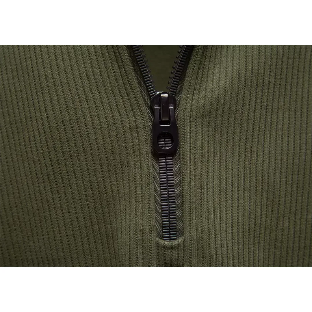 Trui met kwart rits en opstaande kraag, uitgevoerd in een effen olijfgroene tint. De ribstructuur geeft de stof een subtiele textuur, terwijl raglanmouwen en een regular fit zorgen voor bewegingsvrijheid en een comfortabele pasvorm. Afgewerkt met een elastische boord aan mouwen en onderzijde, zonder zakken, en geschikt voor dagelijks casual gebruik in het najaar.