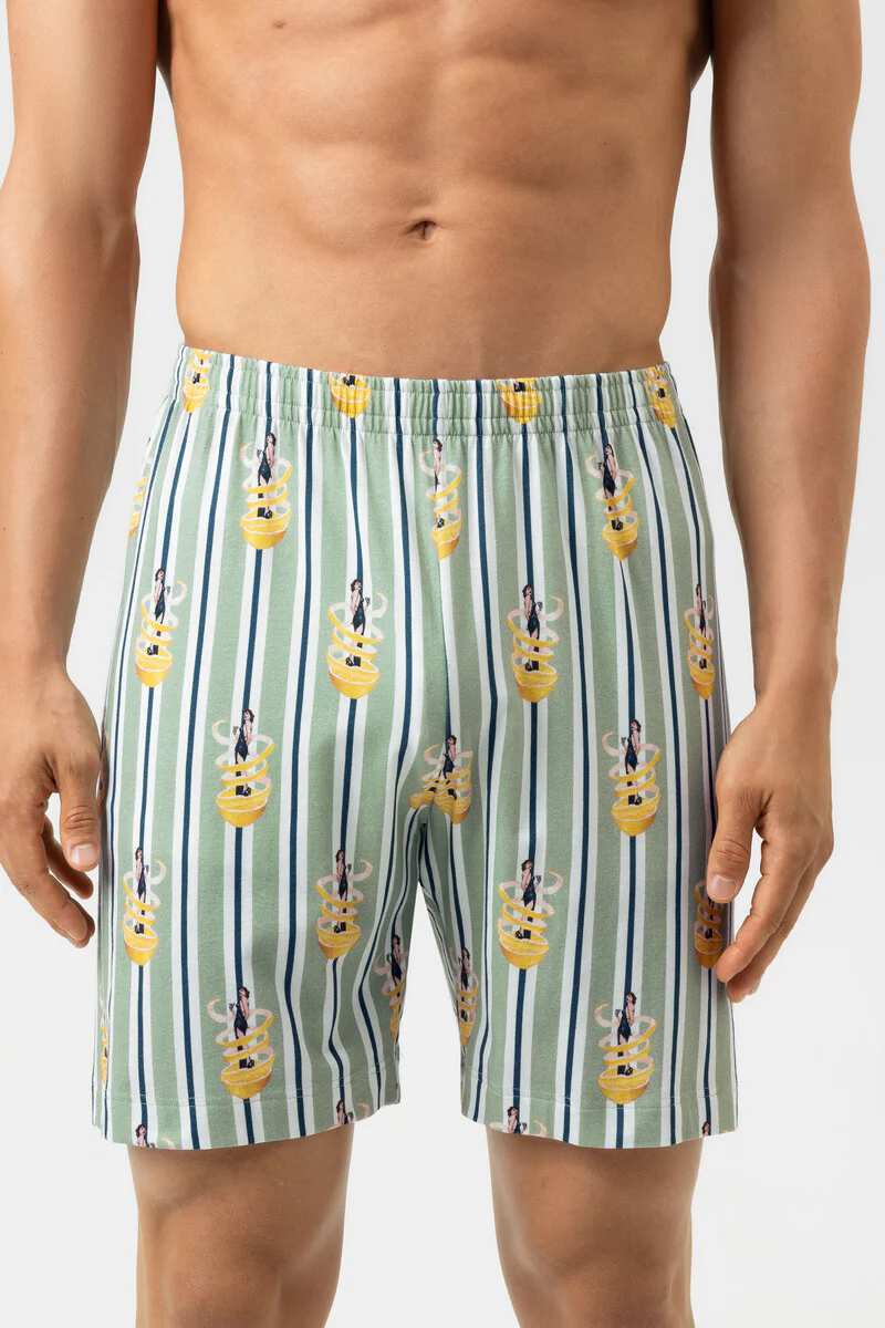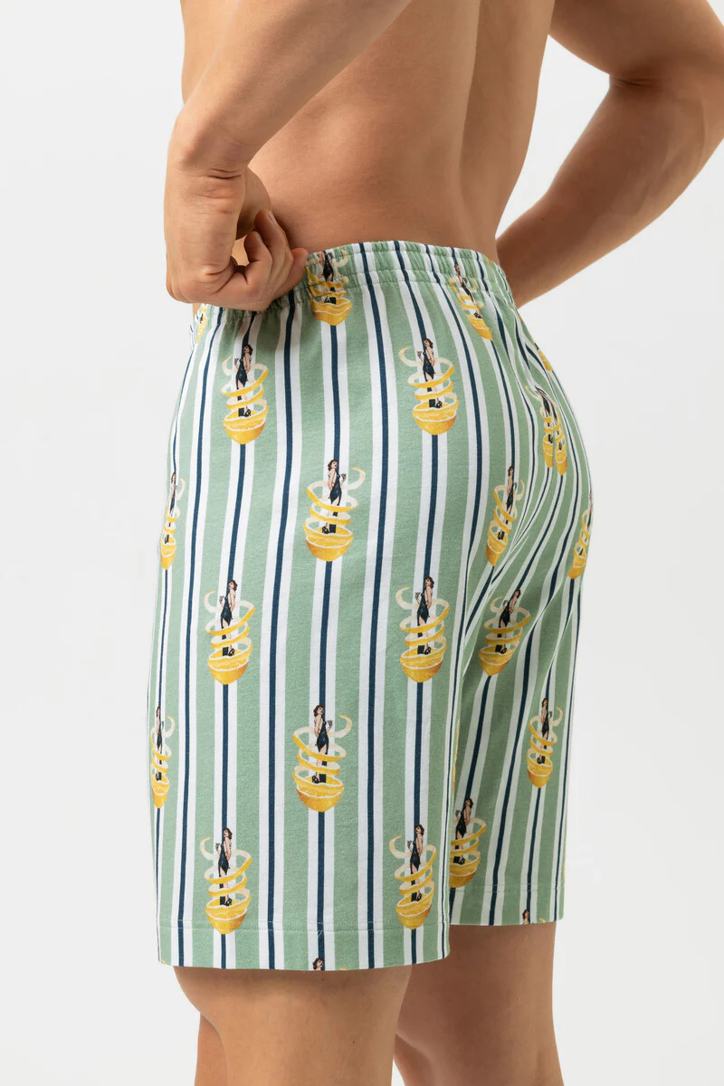 De korte broek (serie Fizz & Flavours) in de kleur Frog Green staat voor ontspannen loungewear met een fris karakter. Door een bijzonder hoog katoengehalte (94%) is dit product bijzonder ademend en huidvriendelijk. De serie Fizz & Flavours combineert zomerse citroenprints met eersteklas draagcomfort en een aangenaam zacht gevoel – ideaal voor ontspannen dagen en nachten. Onze broeken zijn Oeko-Tex® Standard 100-gecertificeerd, wat betekent dat u met dit product actief kiest voor textiel dat is getest op schadelijke stoffen.