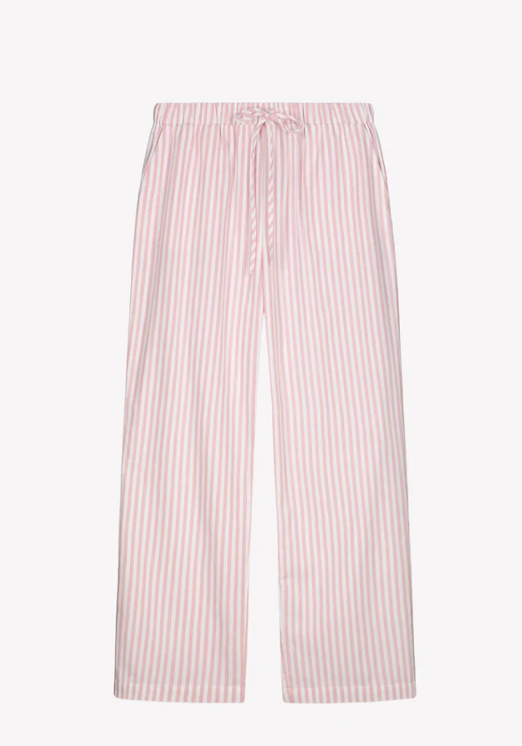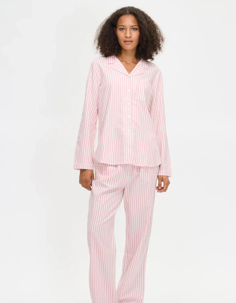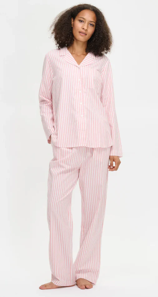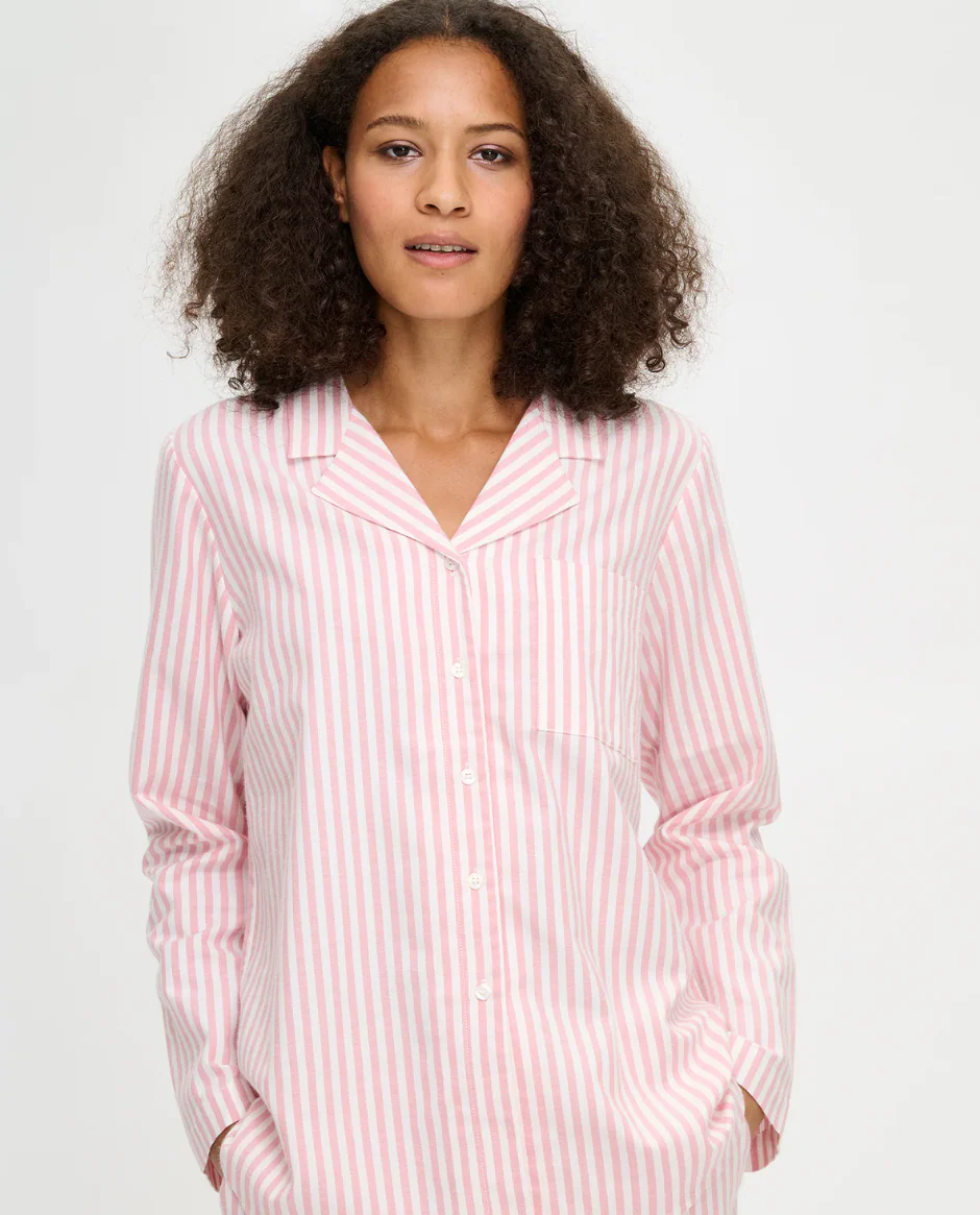 De Nanso Polka pyjama in roze combineert tijdloze strepen met heerlijk draagcomfort. De pyjamabroek heeft zijzakken, een elastische tailleband met trekkoord en is gemaakt van zachte katoenen flanel – warm en comfortabel met een natuurlijke pasvorm (lengte ca. 74 cm, maat M). Het pyjamashirt heeft lange mouwen, een klassieke kraag, knoopsluiting en afgeronde zoom (lengte ca. 70 cm, maat M). Gemaakt van 100% katoen – ideaal voor knusse nachten en ontspannen ochtenden.