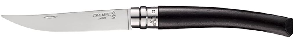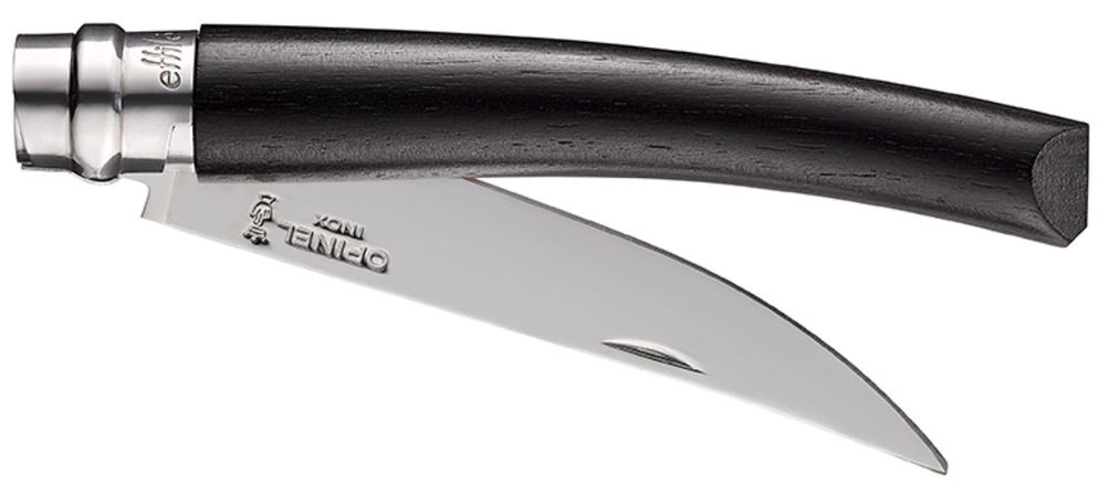 Het Opinel No.10 Effilé zakmes heeft een heft van ebbenhout. Deze zeldzame houtsoort komt uit de Afrikaanse bossen en heeft een luxe uitstraling. Dit hout is geliefd vanwege de dichtheid en de diepzwarte kleur. Om het hout te beschermen en ze zacht aan te laten voelen, is het hout gepolijst met een speciale wax.