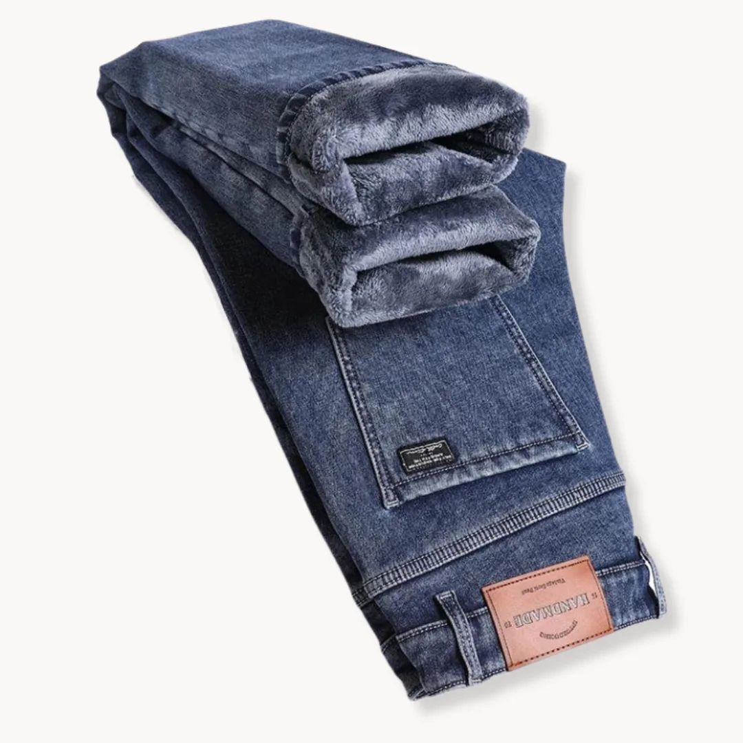 Rechtdoorlopende jeans met een zachte fleece voering bieden extra warmte tijdens koude dagen. Deze denim broek heeft een normale pasvorm en een klassieke vijf-pocket stijl. De rits- en knoopsluiting en riemlussen zorgen voor praktisch gemak, terwijl het effen donkerblauw en het rechte model een tijdloze, casual uitstraling geven.