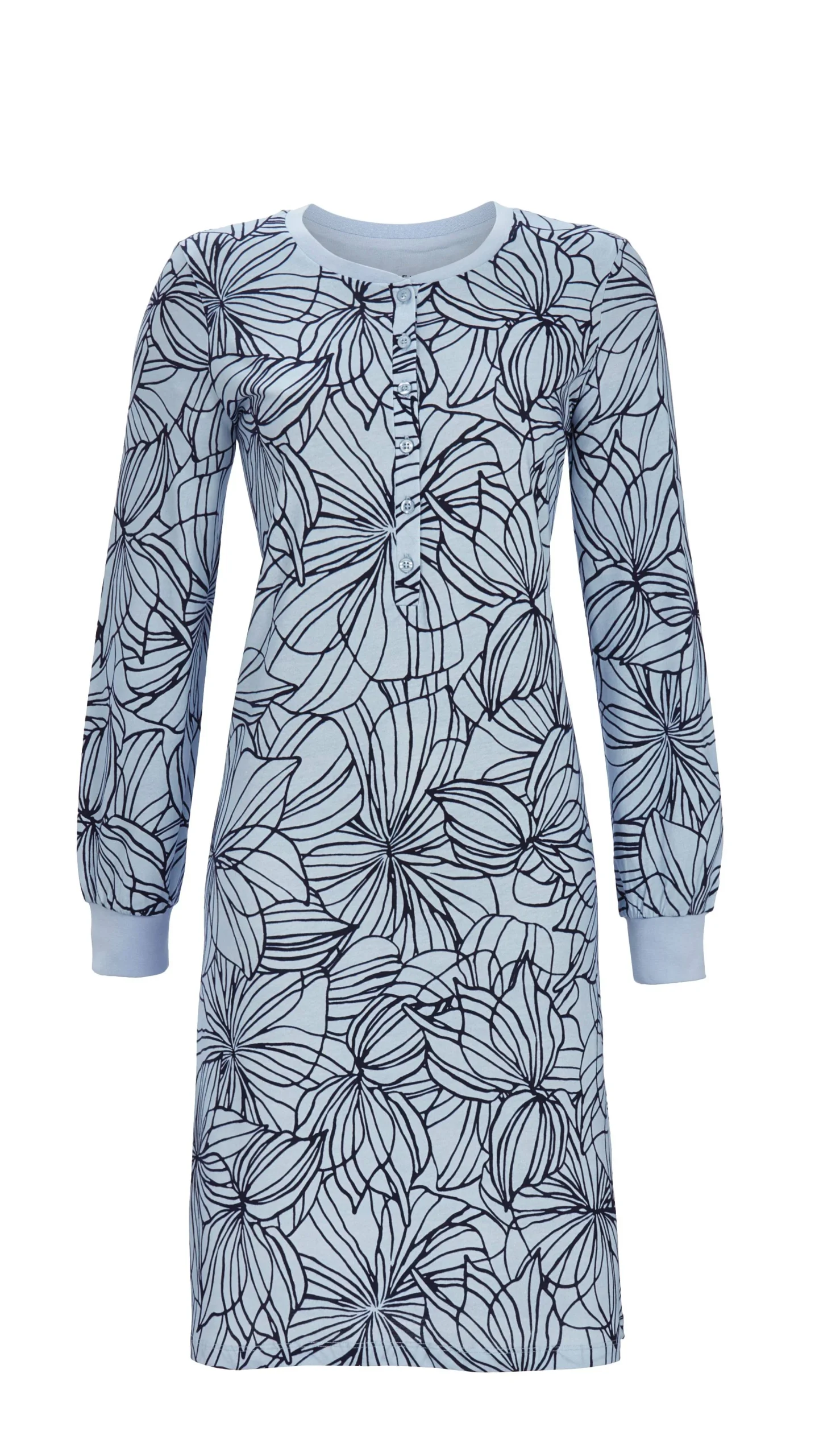 Het Ringella nachthemd met abstracte print combineert stijl en comfort voor een ontspannen nachtrust. Dit elegante lange mouwen sleepshirt heeft een praktische knoopsluiting en gebreide boordjes bij hals en mouwen voor een casual, warme pasvorm. Gemaakt van 100% katoen in zachte single jersey-kwaliteit, biedt het een comfortabel draaggevoel en een frisse, creatieve uitstraling. Perfect voor gezellige nachten thuis.