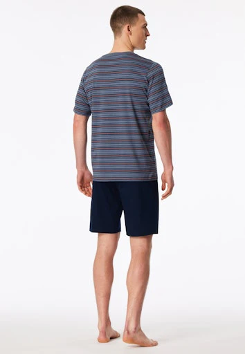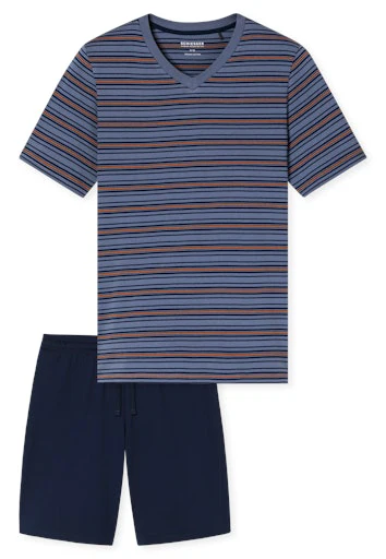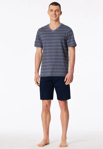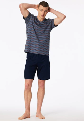 Deze korte herenpyjama uit de Schiesser Casual Nightwear-serie combineert modern design met comfortabel draagcomfort. Het gestreepte T-shirt in blauwgrijs en bruin heeft een V-hals voor een relaxte look, terwijl de korte broek met bindkoord een perfecte pasvorm biedt. Ideaal voor warme nachten of ontspannen momenten thuis.