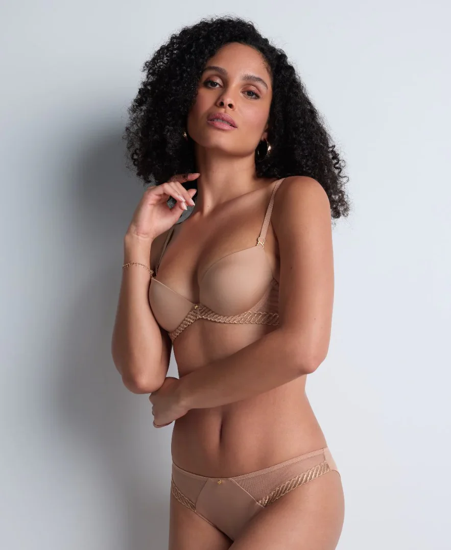 De Sheer Emotion voorgevormde push-up BH biedt een natuurlijk uitziend push-up effect en is gemaakt van zachte stof voor een ongeëvenaard gevoel van comfort. Het ontwerp combineert elegante details met luxe afwerkingen, waardoor het een ware verleiding is voor elke gelegenheid. De sexy, opvallende borduursels aan de voorkant en het glinsterende goud voegen een subtiele glamour toe, terwijl de Tule aan de achterkant de verleiding verhoogt met een blik op de blote huid.
