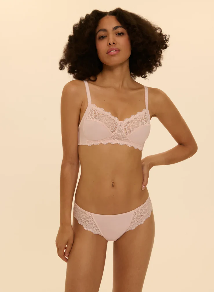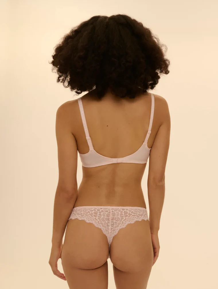 Elegante tanga van zachte mesh en kant, met een ondoorzichtige voorkant voor optimale dekking. Zijkanten en achterkant volledig van kant met subtiele festonrandjes die de rondingen volgen, waardoor de tanga onzichtbaar blijft onder kleding. Perfect te combineren met de Caresse 3D Plunge bh.