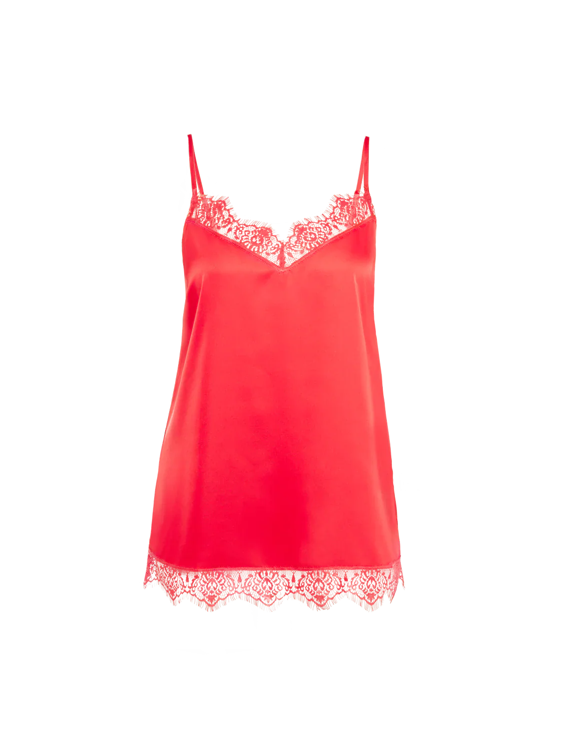 De top heeft een V-hals en is afgewerkt met verfijnd eyelash kant langs de halslijn en onderzoom, wat zorgt voor een romantische en vrouwelijke touch. Dankzij de losvallende pasvorm en verstelbare spaghetti bandjes draagt de top heerlijk comfortabel.
