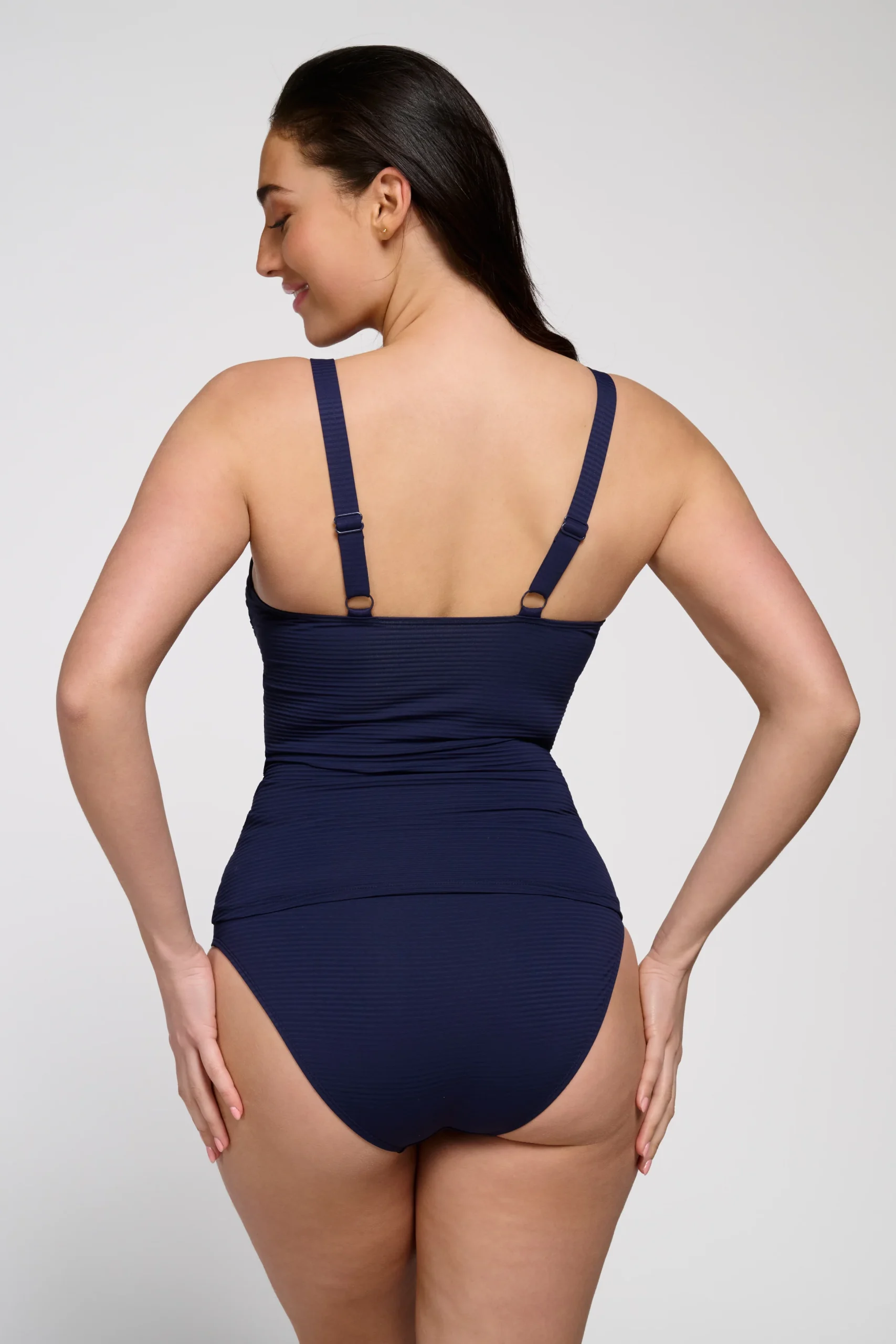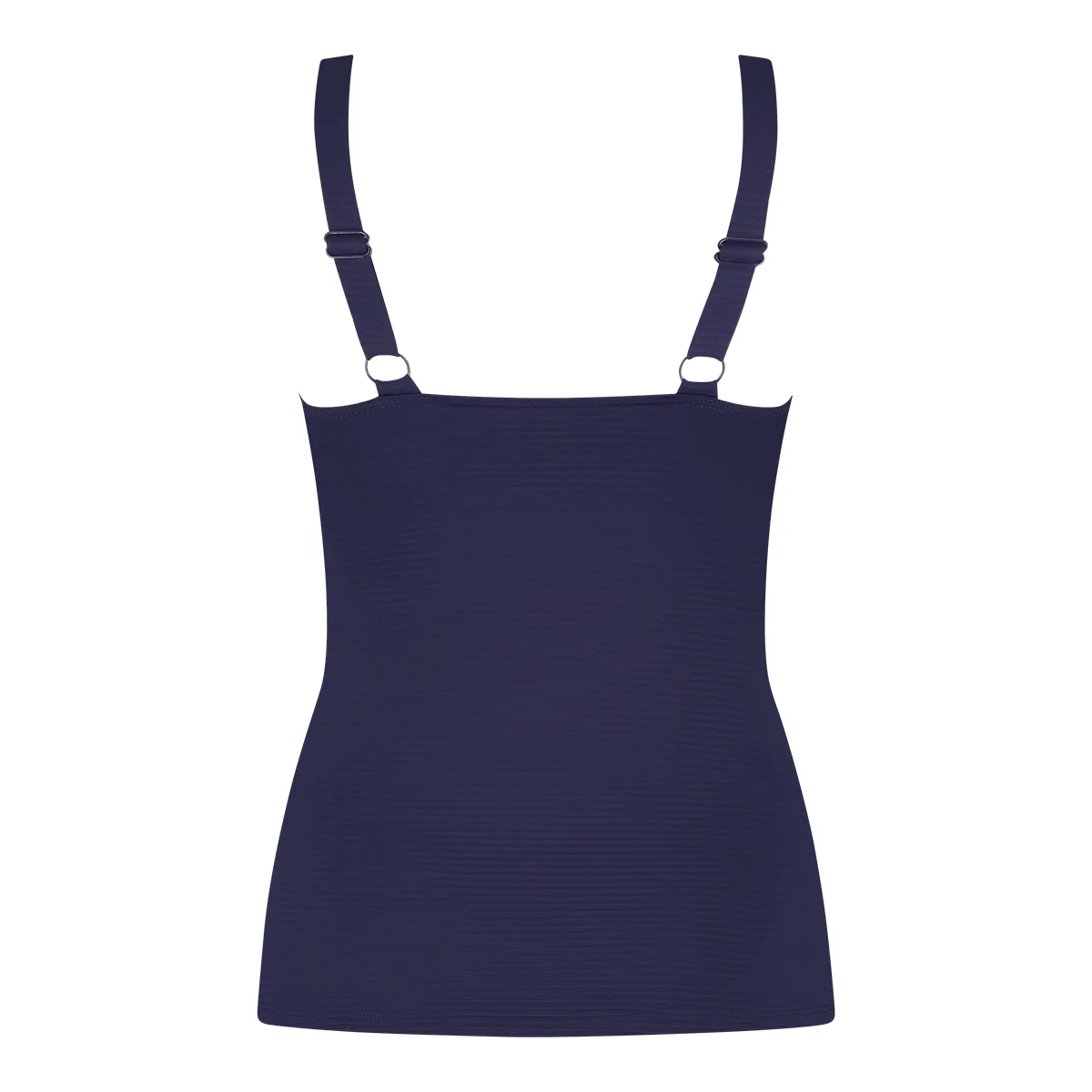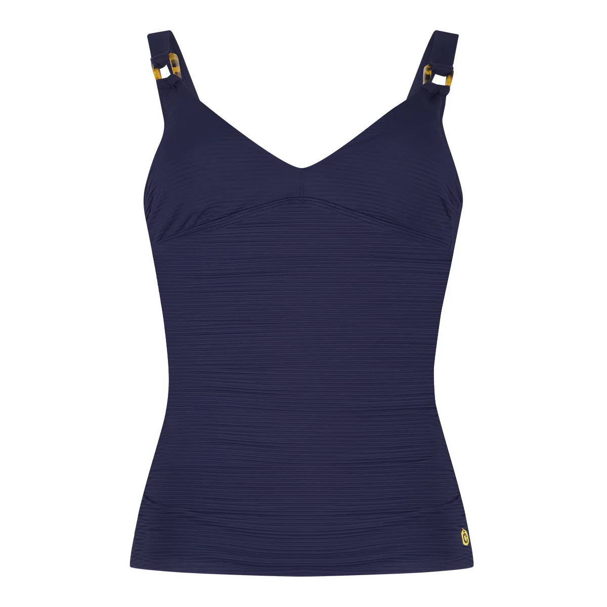 De Ten Cate Tankini Top V-Neck Padded combineert stijl en comfort. De subtiele streepstructuur in de stof geeft een elegante look, terwijl de voorgevormde cups zonder beugel voor een natuurlijke lift en een mooi gevormd decolleté zorgen. Dankzij de verstelbare bandjes en lichte plooitjes over de buik biedt de top een flatterende, aansluitende pasvorm met een subtiel corrigerend effect.