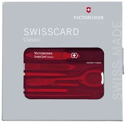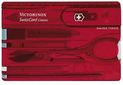 SwissCard Classic, Victorinox, Ruby. Multitool van transparant rood plastic in creditkaart model. Afmetingen 82 x 54 x 4 mm.