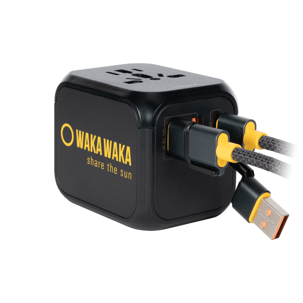 De WakaWaka World Travelcharger blijft je van stroom voorzien waar je ook bent. De World Travelcharger werkt op meer dan 220 bestemmingen en heeft twee USB-A-poorten en een krachtige 30W USB-C-poort, perfect voor het snel opladen van telefoons, tablets, computers en WakaWaka-spullen. Daarnaast is hij compact en licht van gewicht, dus de perfecte reisgenoot voor elke reis.